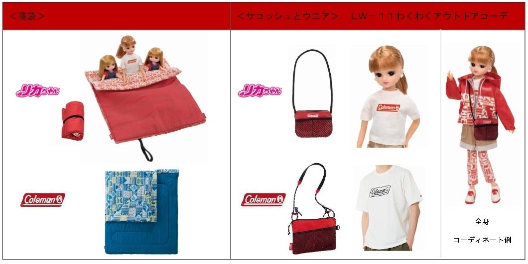 「わくわくおとまりキャンピング」は「コールマン」のデザインをリカちゃん風にアレンジしたテント、寝袋、ハンモック、メスティンがセットになった、おとまりキャンプの一連の流れを楽しめるセットです。寝袋は1人用とファミリー用の2タイプの形にでき、ハンモックはブランコ型にもなる2way仕様です。着せ替え服「LW-11 わくわくアウトドアコーデ」は流行の、アクティブなアウトドアスタイルを再現したもので、「コールマン」のブランドロゴ入りTシャツやサコッシュなど、人気の「コールマン」グッズをリカちゃんサイズにいたしました。