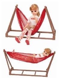 テントは約30cm×30cmと、リカちゃんだけでなく家族と一緒に入ることができるサイズです。テントの入り口には、ワンポイントとしてコールマンファンの間でおなじみのテルテル坊主『サンシャインキャッチャー』が描かれています。『サンシャインキャッチャー』は2021年3月にコールマンより発売以来、雨除け祈願のアクセサリーとして、また自分のテントの目印にもなる実用品としても人気のグッズです。リカちゃんファミリーも「コールマン」のいちファンとして、早速家族のテントに取り入れています。ハンモックはブランコ型にもなる2way仕様で、キャンプ場での様々な遊びやストーリーを想像しながら楽しめる工夫をいたしました。