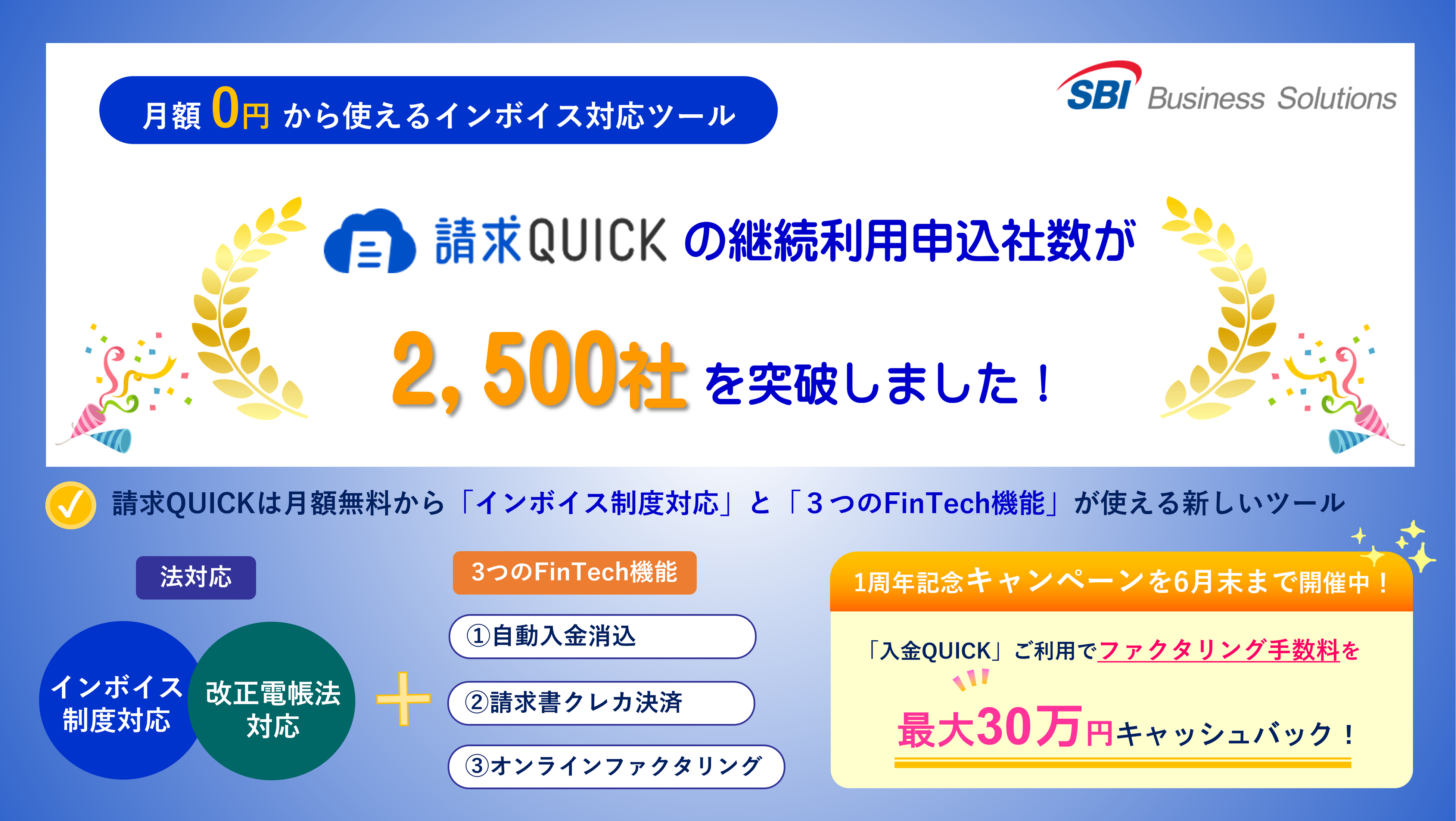総合フィンテックソリューション企業であるSBI FinTech Solutions株式会社の子会社で、バックオフィス支援サービスを提供するSBIビジネス・ソリューションズ株式会社(本社:東京都港区、代表取締役社長:夏川 雅貴、以下「当社」)は、中小企業のインボイス制度対応をサポートするクラウド型請求書管理システム「請求QUICK」において、継続利用のお申し込み社数が2,500社を突破しましたので、お知らせいたします。