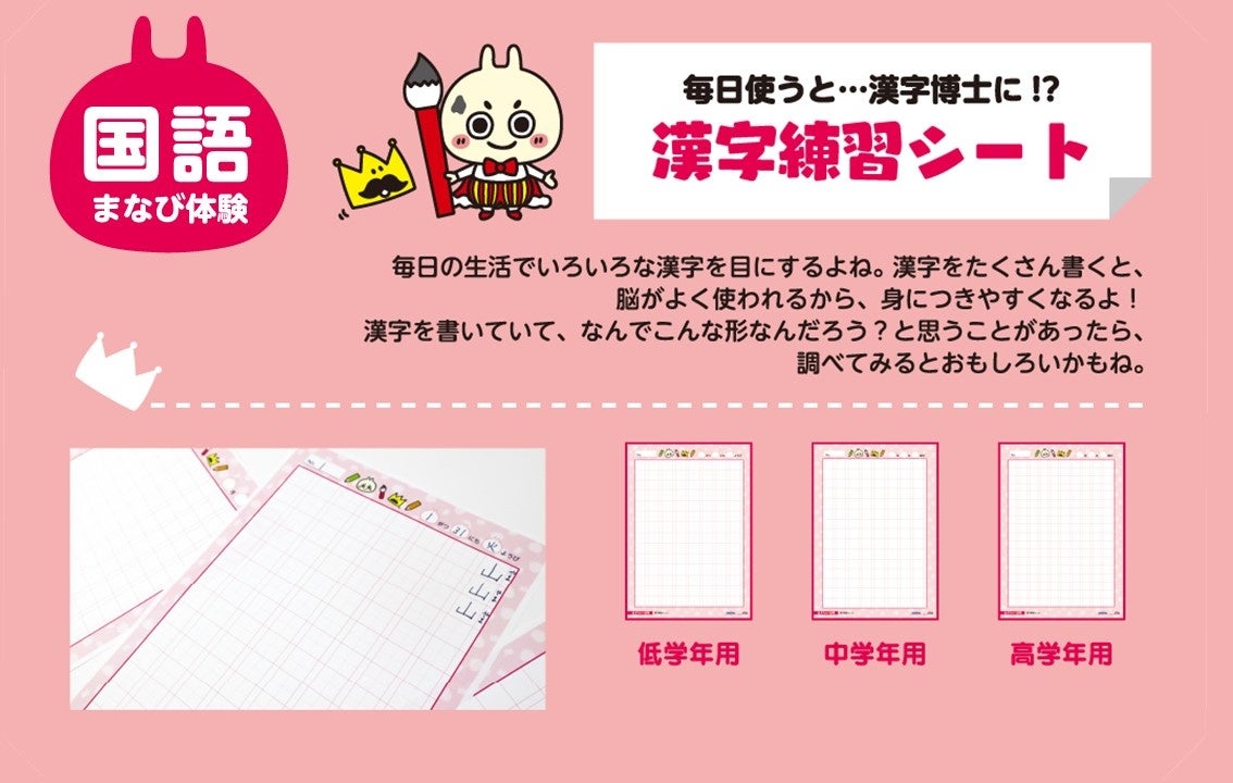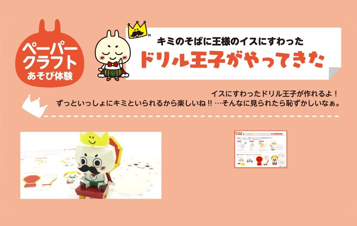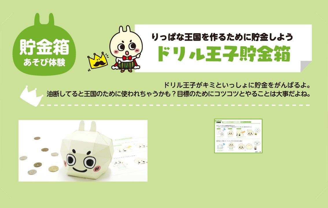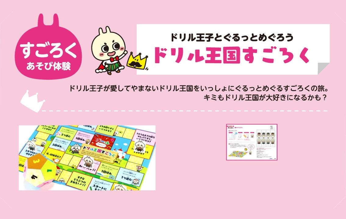 ●遊び体験:自分で作れる暗記カード、ドリルの王様賞状、ドリルの王様すごろく、四コマ漫画、ドリル王子ペーパークラフト、ドリル王子貯金箱、ドリル王子着せ替え