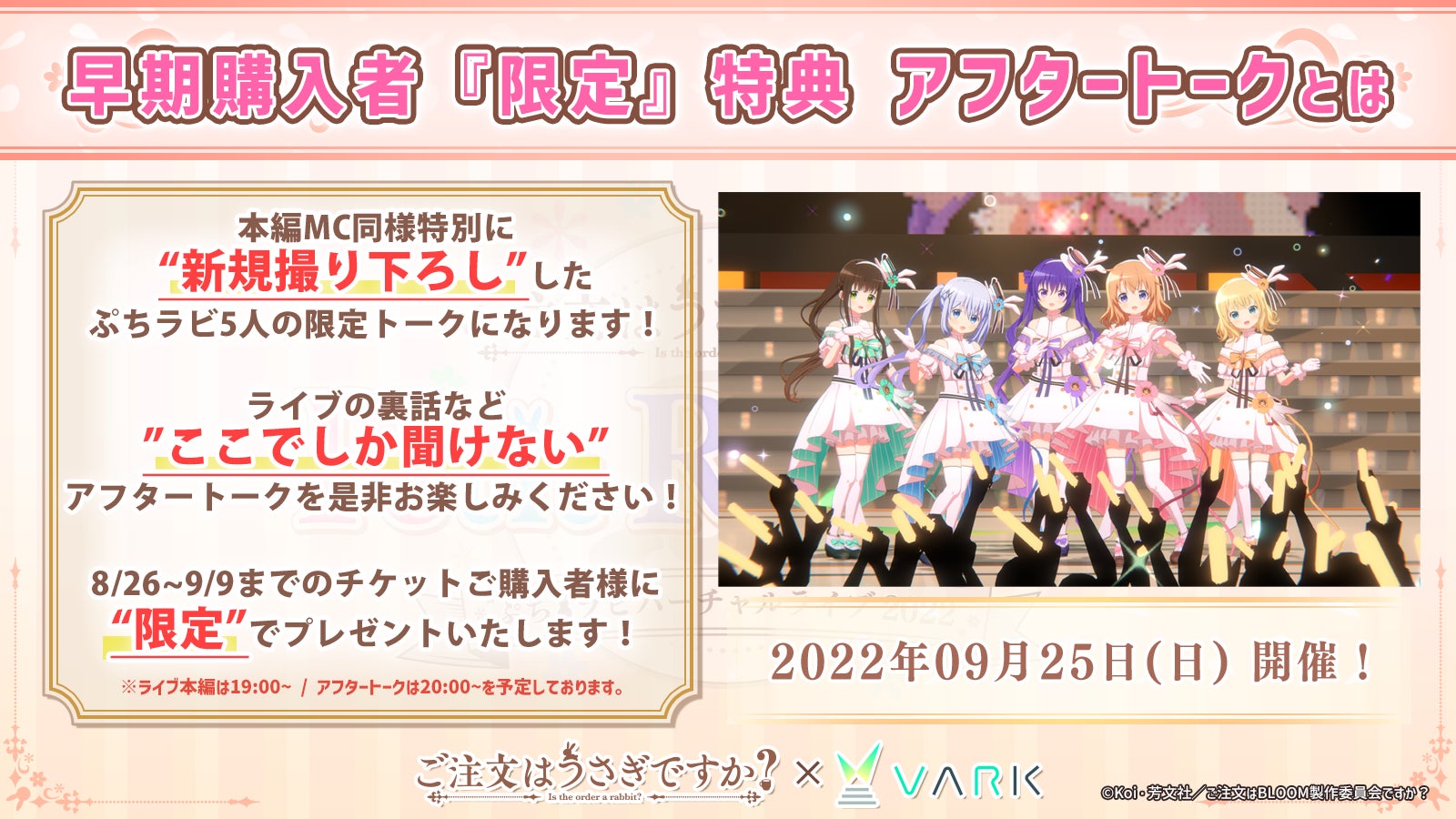 本ライブは、19時開演予定の「ライブ本編」と20時開演予定の「アフタートーク」の2部制となっており、「アフタートーク」では本編MC同様特別に新規撮り下ろしを行った、ぷちラビ5人の限定トークをお楽しみいただけます。
