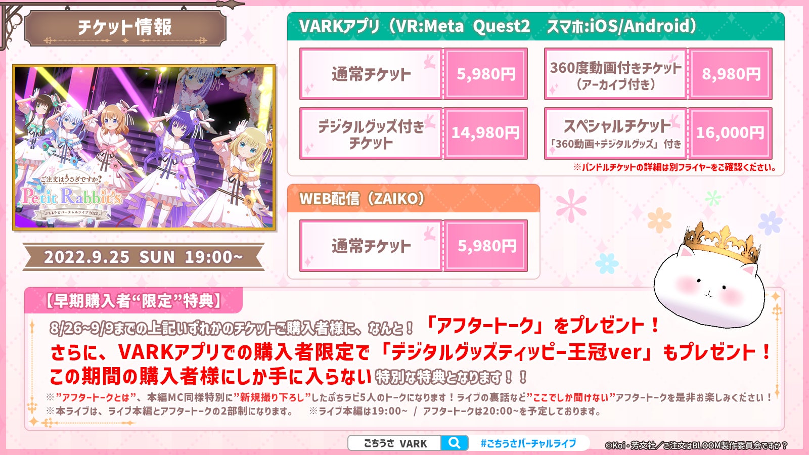 エンターテイメント特化型メタバース「VARK」を運営する株式会社VARK(本社:東京都豊島区 代表取締役:加藤卓也、以下VARK)は、人気TVアニメ「ご注文はうさぎですか?」初のバーチャルライブを9月25日(日)に開催するにあたり、チケットの販売を開始したことをお知らせいたします。