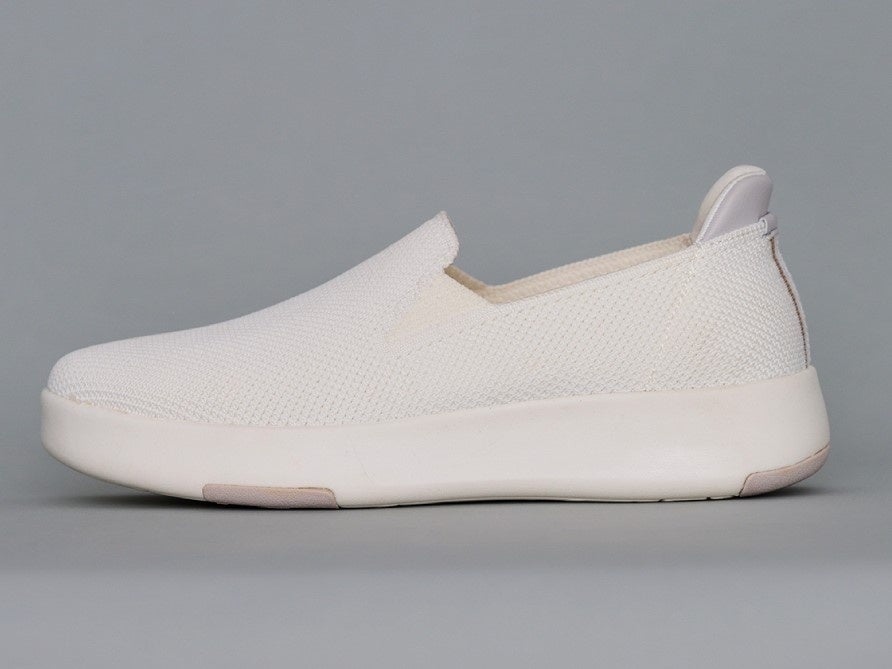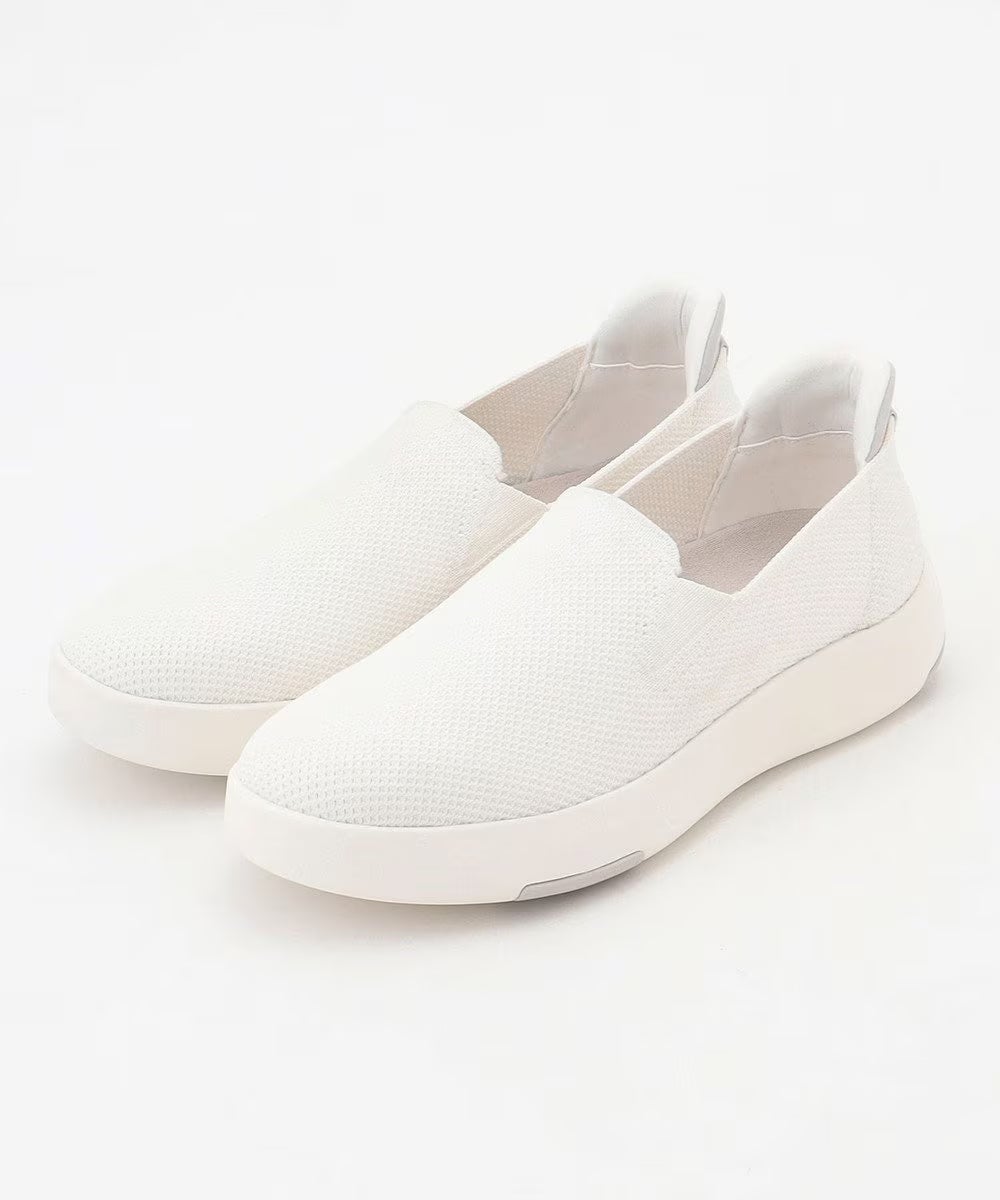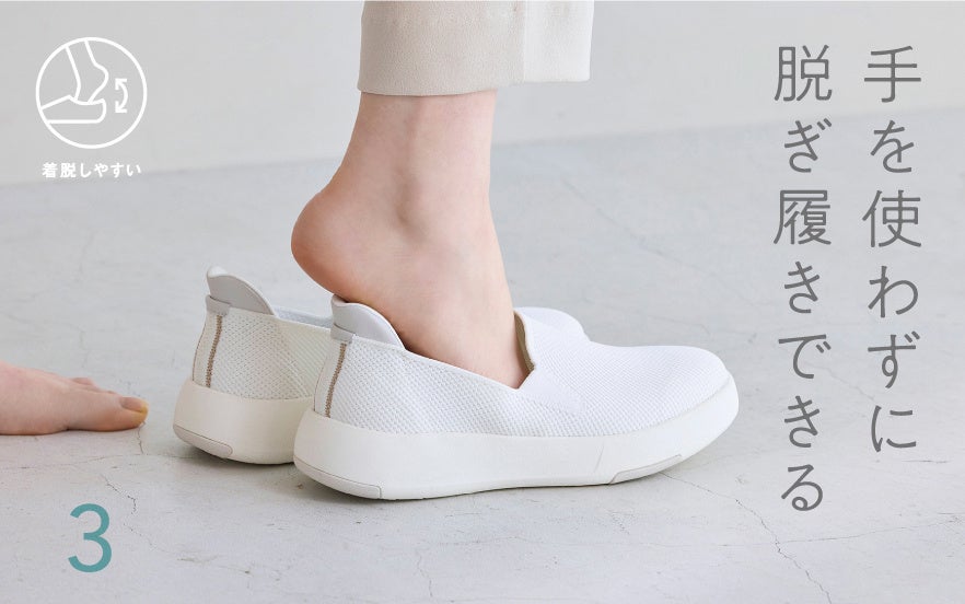 スリッポンタイプのニットシューズ。独自に開発したヒールサポートにより、手を使わずさっと脱ぎ履きができます。