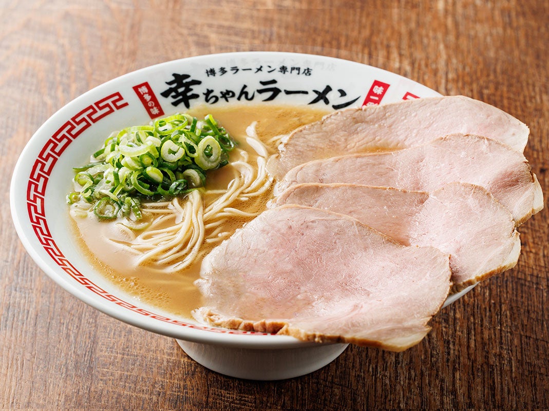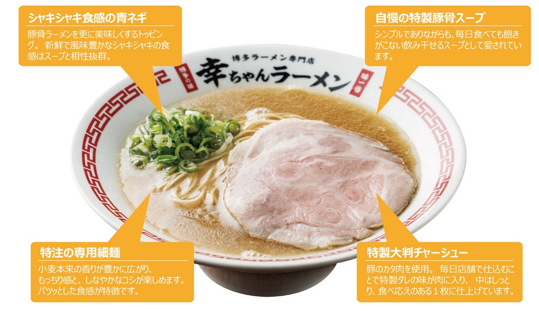 博多ラーメン専⾨店 幸ちゃんラーメン(こうちゃん)は、本場博多はもとより国内外10カ国で愛されている元祖泡系豚⾻ラーメン『博多⼀幸舎』がプロデュースする、豚⾻ラーメンブランドです。2025年6⽉現在、国内に18店、海外2店舗を展開し、看板商品の「博多豚⾻ラーメン」は、試⾏錯誤の後、しっかりと豚⾻の旨味(パンチ)と、ほんのり感じる⽢みがクセになるスープが特徴の豚⾻ラーメンとして完成しました。そして、麺は幸ちゃんラーメンの為だけに特別配合したこだわりの⼩⻨粉を使用。幸ちゃんラーメンオリジナルの豚⾻スープに合うよう、特注の細麺を使⽤しています。⼩⻨本来の⾹りが豊かに広がり、もっちり感と、しなやかなコシを楽しめ、パツッとした⾷感がついつい替⽟を注⽂したくなるほどクセになります。こだわりの、しっとりとした特製⼤判チャーシュー、シャキシャキの⻘ネギと⾷べ進めていただくことで、本場博多の町豚⾻を感じていただけます。そんな幸ちゃんラーメンは、お⼦様からご年配の⽅、⽼若男⼥問わず幅広い⽅達より「早い、美味い、また来たい!」本場博多の町豚⾻として⽀持いただいてます。