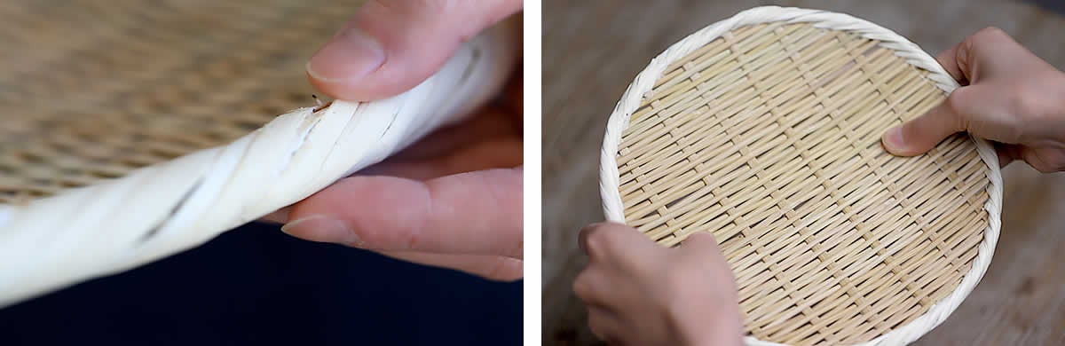 熟練の職人が一本一本手作業で丁寧に編み上げた丸竹ざるは、カマボコ状に削られた厚みのある竹ひごを使用し、水切れの良さと丈夫さを兼ね備えた構造が特徴です。竹ひごの編み込みには、特殊なネジリ加工が施されており、長期間使用しても形崩れしません。また、籐巻きによる縁巻きも、しっかりとした作りで竹ざるの耐久性をさらに高めています。
