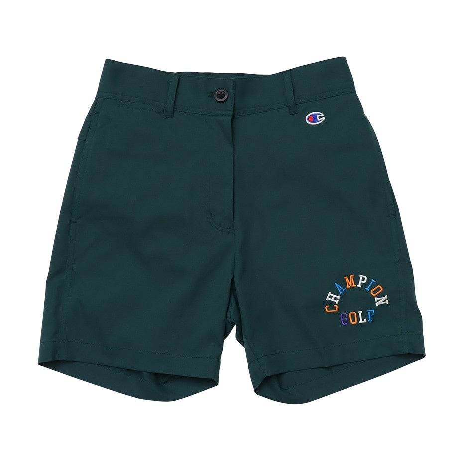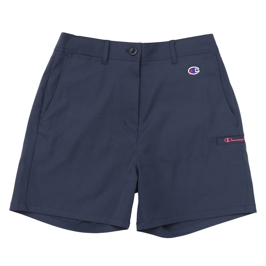 ポリエステルの捲縮(けんしゅく)糸を使用することで、高いストレッチ性による動きやすさと、ドライ感のある肌触りの良さを実現した撥水機能付きショーツです。ウエストはフィット感を高めるゴム入り仕様。両サイドにポケット、右サイドに短いティーやマーカーが入る横長のコインポケット、後部にはDカンを付けています。左サイドにChampion(チャンピオン)ロゴを刺繍しています。