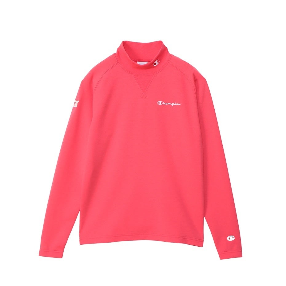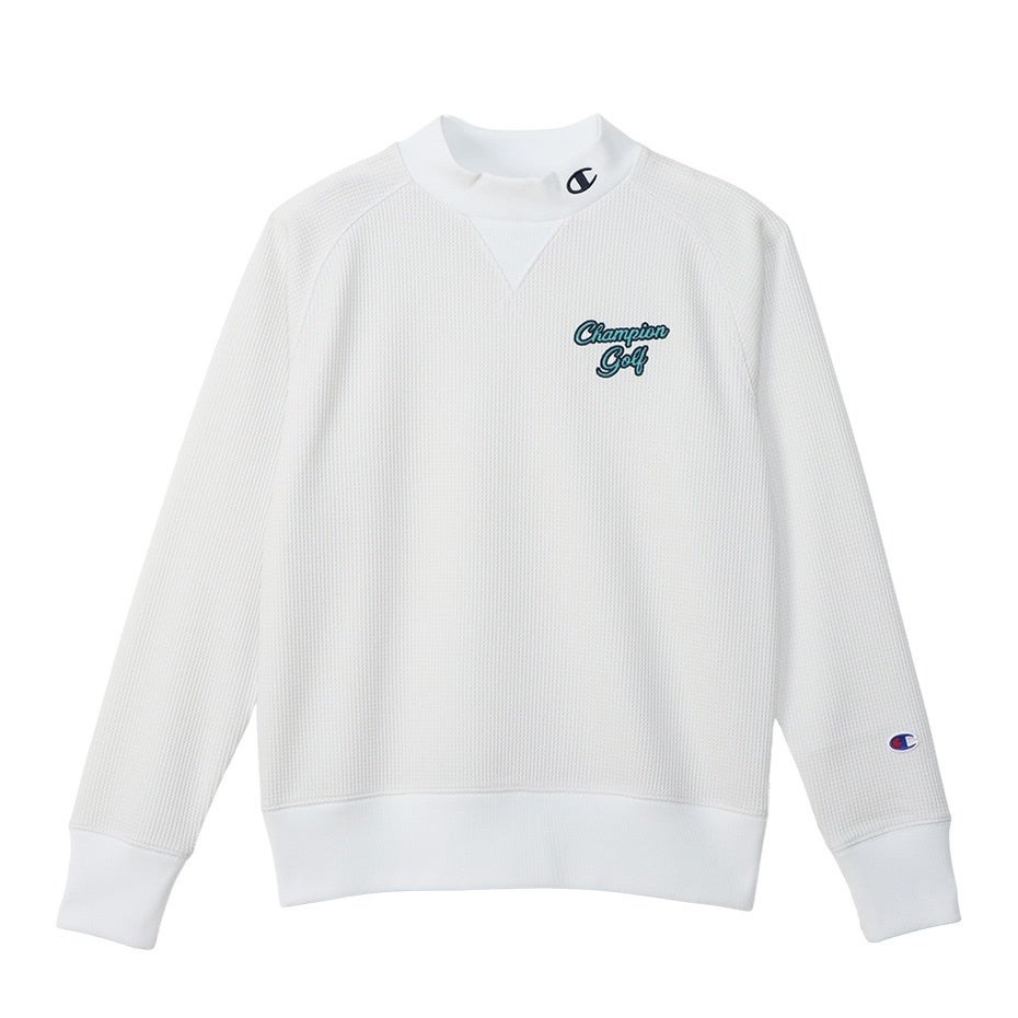 太陽からの赤外線を吸収する際の発熱効果で衣服内温度を上昇させる防寒機能素材「Feelthermo」を使用した、ワッフル生地タイプのモックネックシャツです。首元にヴィンテージスウェットなどに見られるガゼットを付けています。肩の動きをスムーズにするラグランスリーブは腕のカーブに沿いやすいよう計算されたカッティングで、袖と裾はスイング時に邪魔になりにくいリブ仕様。脇下の縫製に静電気が起きにくい糸を採用しています。胸にチェーン刺繍で「Champion Golf(チャンピオン ゴルフ)」、衿にCロゴ、背中にはChampionロゴを刺繍しています。※同じスタイルのメンズアイテム(C3-YG404)も展開しています。