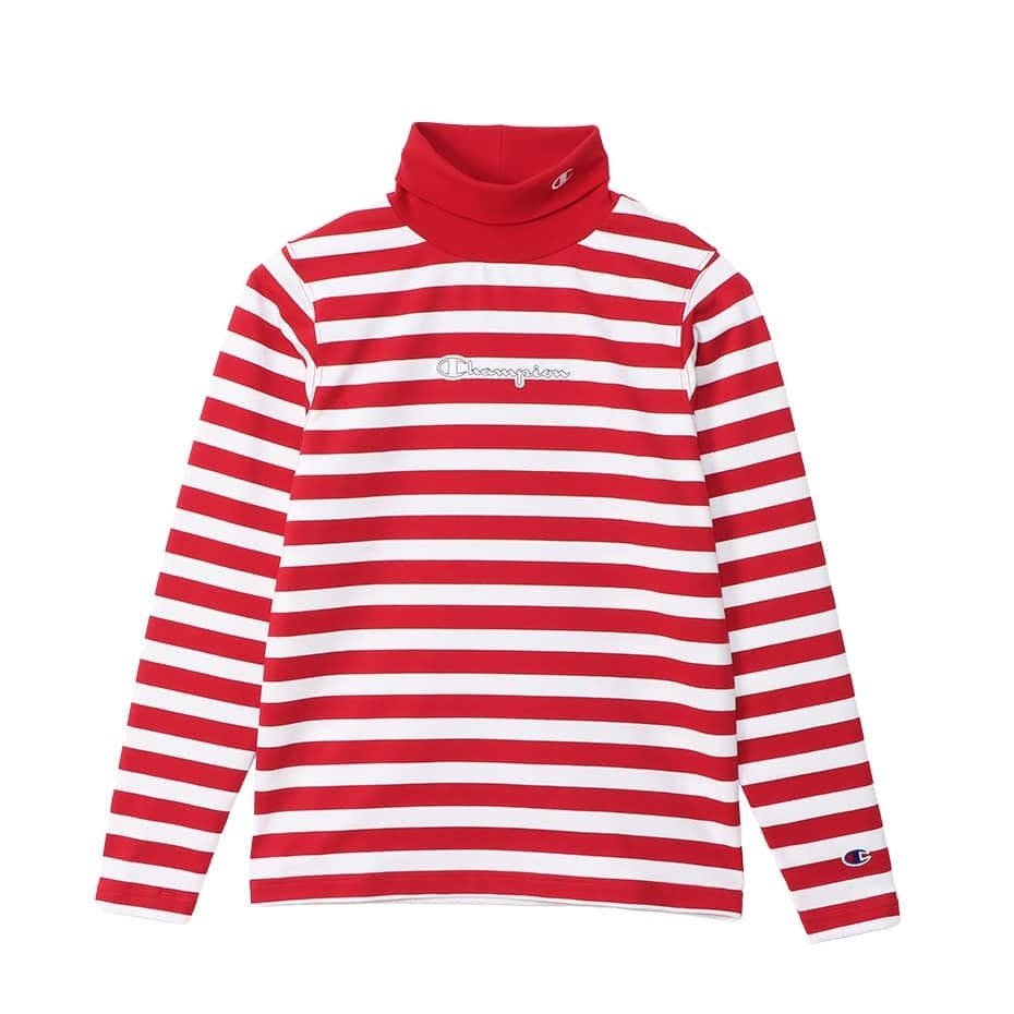 環境に配慮されたリサイクルポリエステルとコットンに、ストレッチ性を高めるポリウレタンを配合した素材で、先染めによるボーダー柄のタートルネックシャツです。裏面を微起毛することで保温性を高め、汗によるニオイの発生をアクティブに抑制し続ける抗菌・防臭機能「C ODORLESS® by Polygiene」加工も行っています。秋には一枚使いで、寒い冬にはインナーとしても活躍する使いやすいアイテムです。袖口は重ね着時に袖が捲れるストレスを軽減するサムループ付き。正面にはChampion(チャンピオン)ロゴのフェルトワッペンを付け、衿にはCロゴを刺繍しています。※同じスタイルのメンズ タートルネックシャツ(C3-YG408)も展開しています。