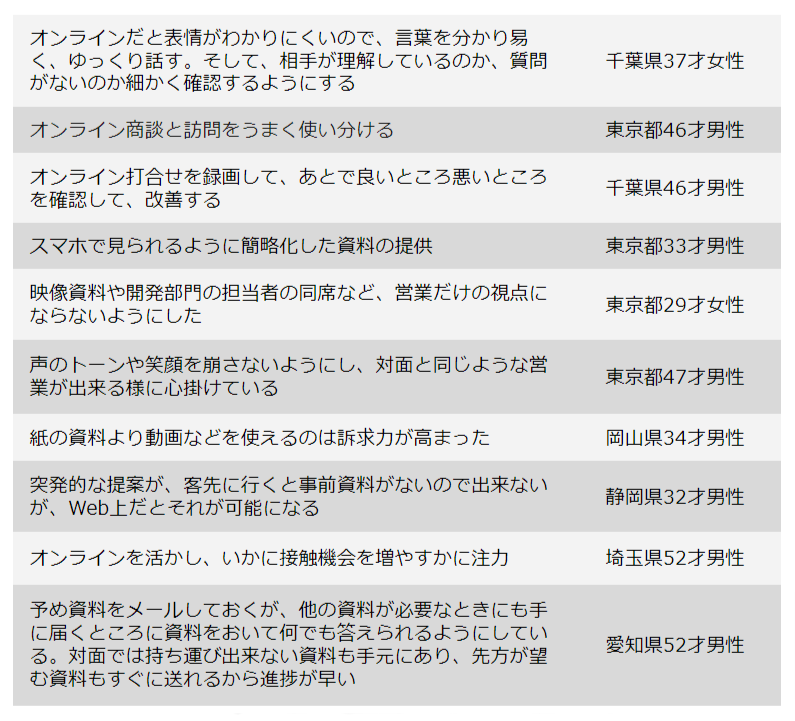 - 「遠方やなかなか時間が取れない中小顧客に対してはオンライン商談という手段が増えたことで明らかに商談機会が増えた」(東京都29才女性)