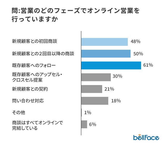 - オンライン営業がよく使われるフェーズは「新規顧客との商談」と「既存顧客へのフォロー」