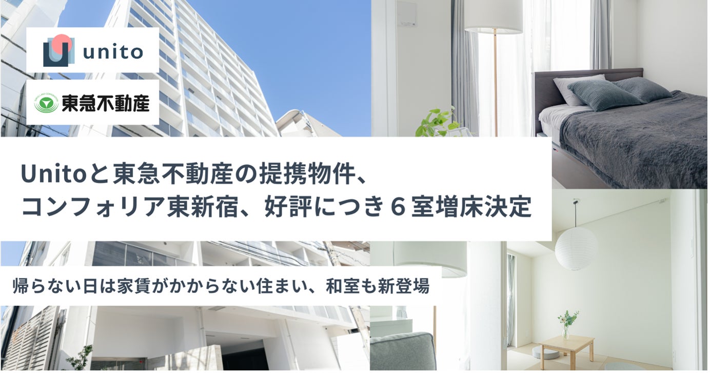 株式会社Unito(東京都千代田区、代表取締役:近藤佑太朗、以下ユニット)は、東急不動産株式会社(本社:東京都渋谷区、代表取締役社長:星野 浩明、以下東急不動産)と提携し、東急不動産が開発する賃貸レジデンス「COMFORIA(コンフォリア)」(以下コンフォリア)ブランドにUnito独自の料金システムである「帰らない日は家賃がかからないリレント」の仕組みを導入した物件「コンフォリア東新宿」について、ご好評につき6室増床することをお知らせいたします。