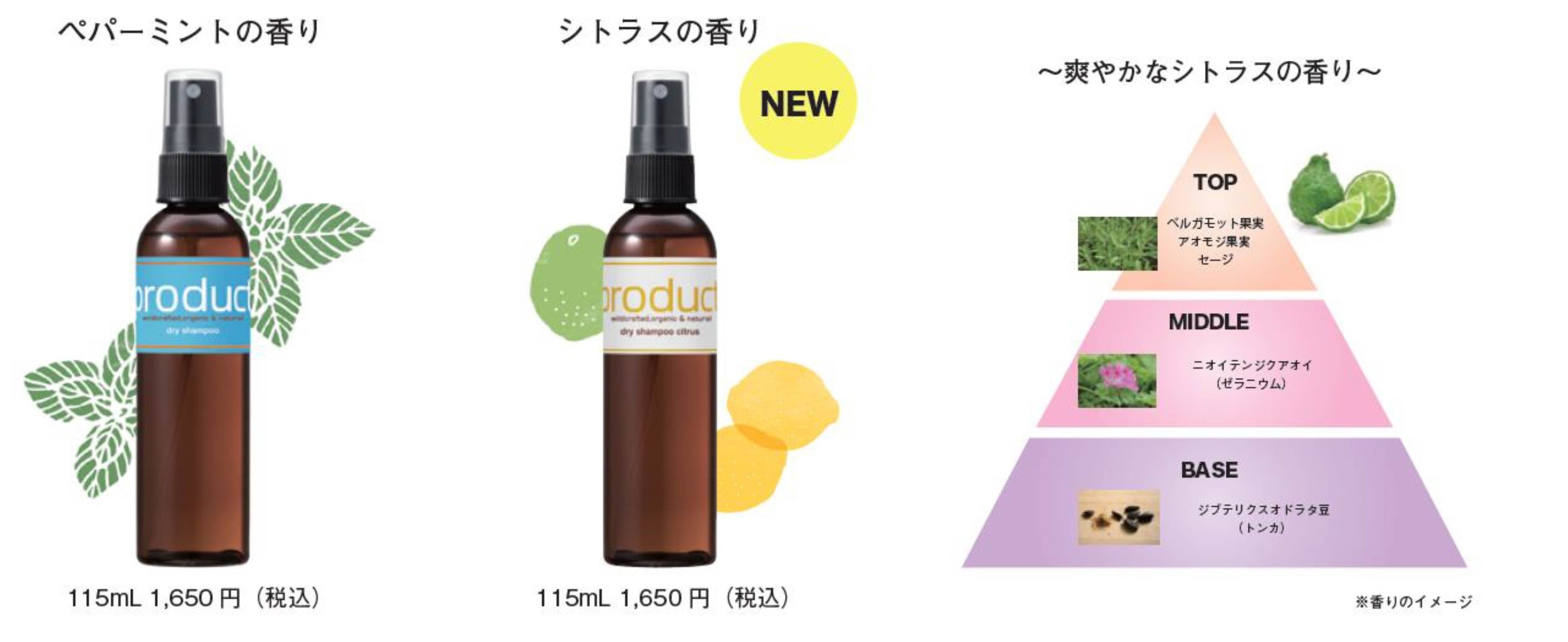 『produt(ザ・プロダクト)』では、2019年よりドライシャンプー(ミントの香り)を販売していますが、手軽にシャンプー時の爽快感と頭皮ケアが出来るとともに、ボディミストにも利用していただけるマルチパーパスアイテムとして、特に湿気の増える梅雨時期や気温の上がる夏場~残暑のシーズンにおいて大変好評をいただいております。この度、ドライシャンプーに新しいシトラスの香りをラインアップいたします。