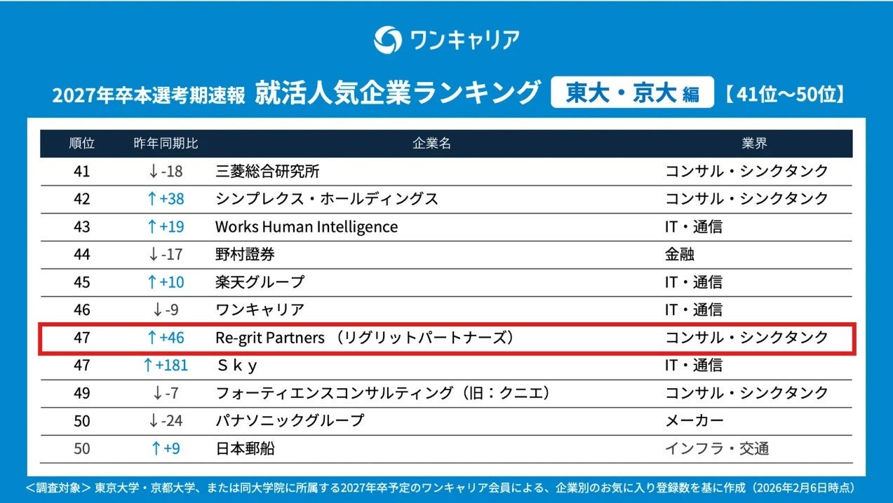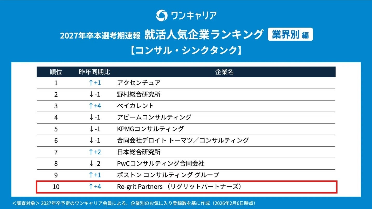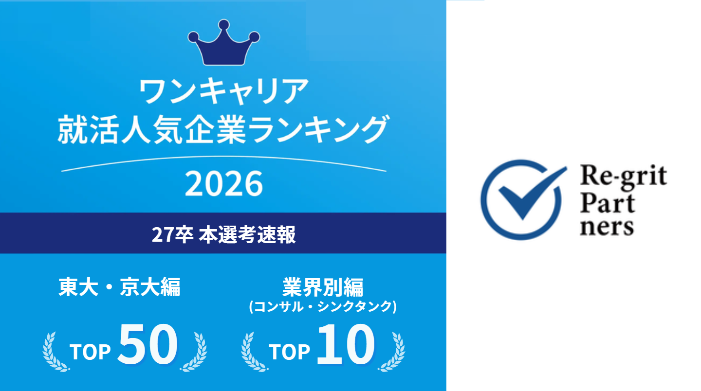株式会社Re-grit Partners(本社:東京都港区、代表取締役CEO:山木智史、以下「当社」)は、株式会社ワンキャリア(本社:東京都渋谷区、代表取締役社長 執行役員CEO:宮下 尚之)が発表した、「ワンキャリア 就活人気企業ランキング -27卒本選考期速報-」において【東大・京大編】で47位にランクイン、【業界別編】のコンサル・シンクタンク部門ではTOP10にランクインいたしました。(※ワンキャリア調べ)