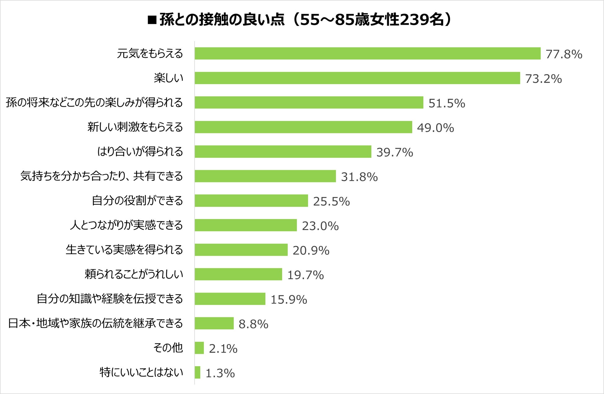 ・孫との接触での良いことは「元気をもらえる」77.8%、「楽しい」73.2%、「孫の将来の楽しみが得られる」51.5%、「新しい刺激をもらえる」49.0%。
