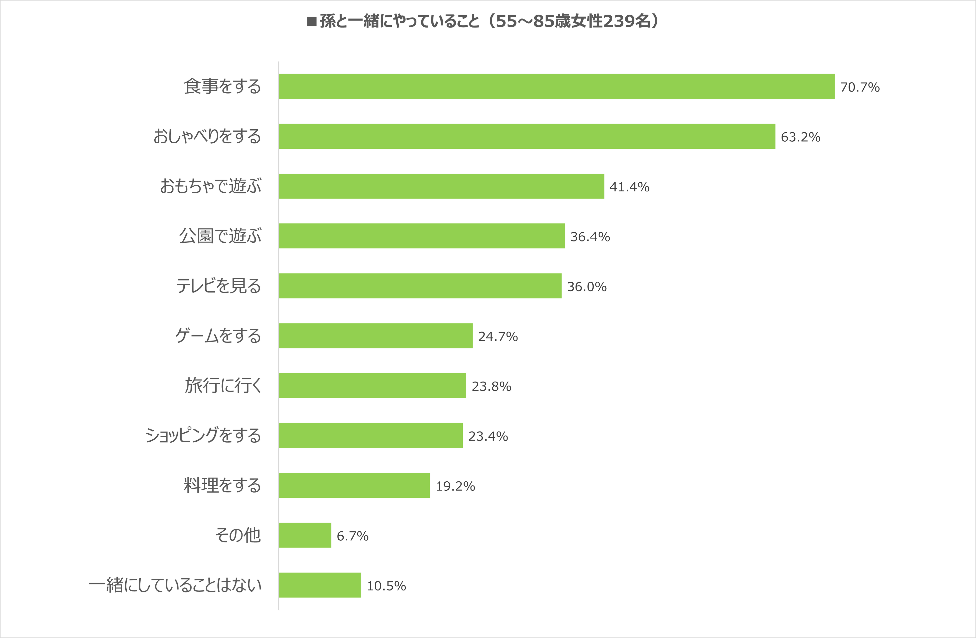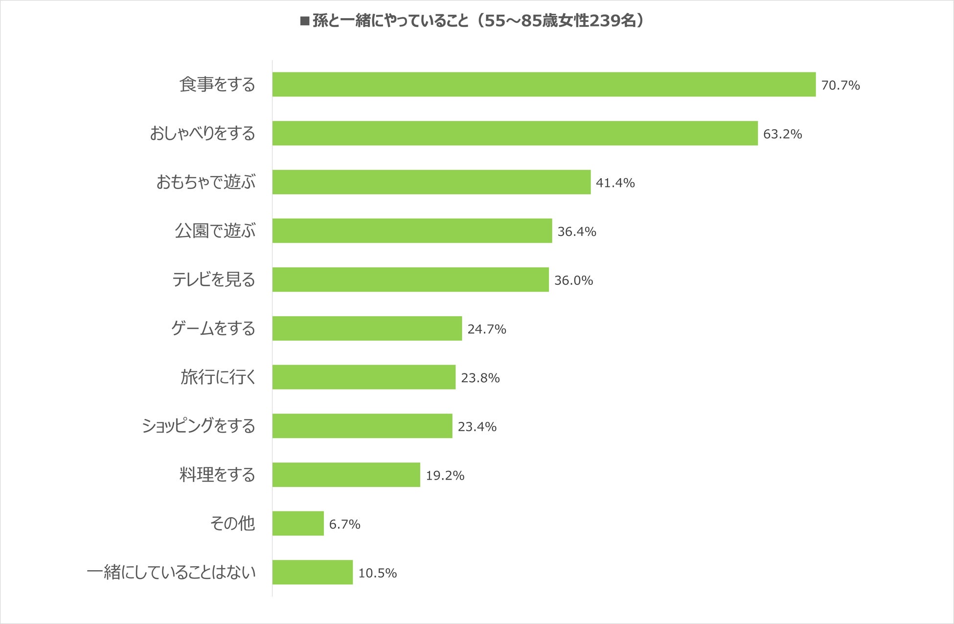 ・孫とは「食事」70.7%、「おしゃべり」63.2%、「おもちゃで遊ぶ」41.4%、「公園遊ぶ」36.4%、「テレビを見る」36.0%、を一緒に行っている。また、4人に1人(24.7%)は、「ゲーム」も一緒にしている。