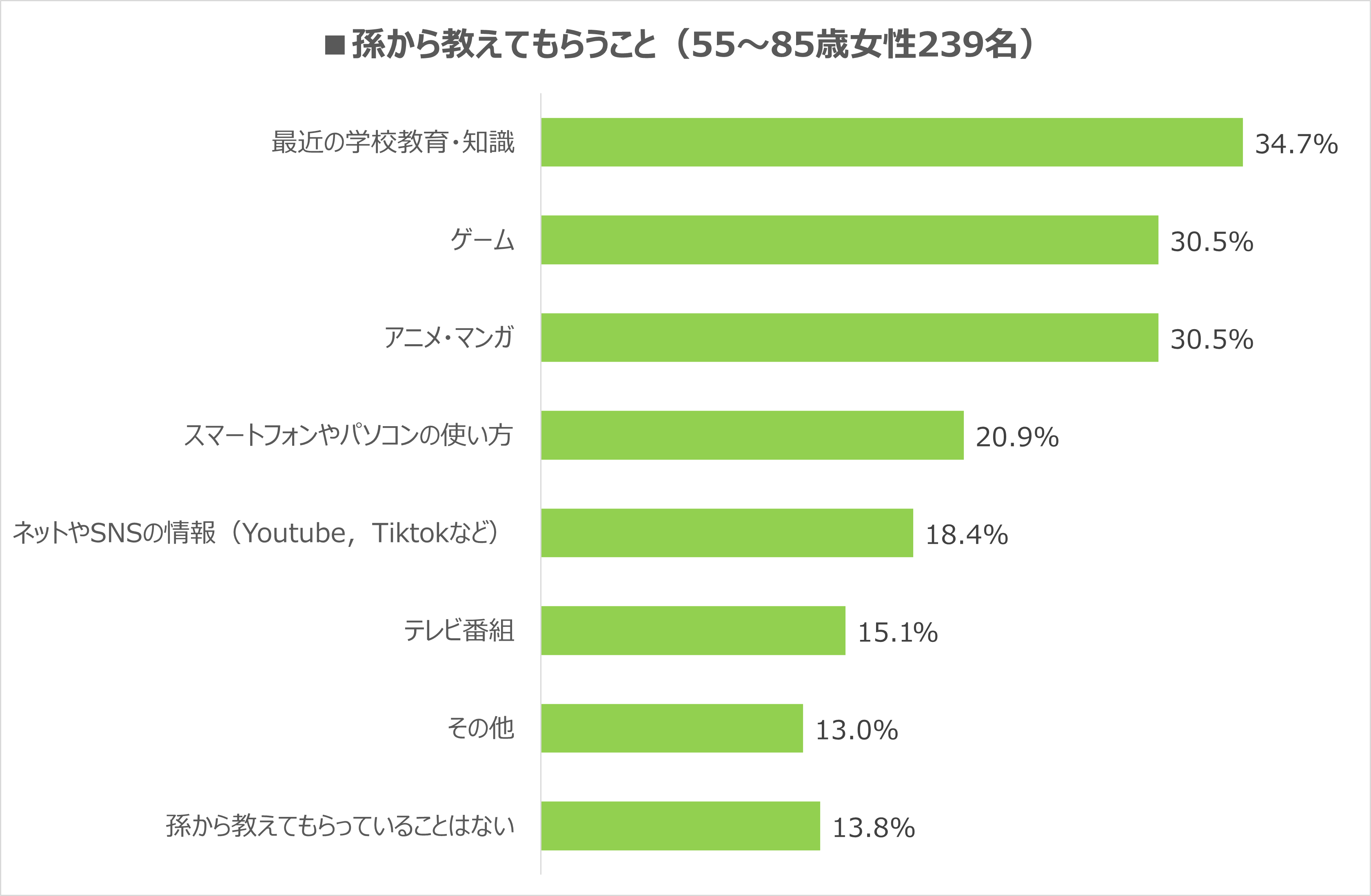 ⇒孫から教えてもらうことは、「最近の学校教育・知識」34.7%、「ゲーム」30.5%、「アニメ・マンガ」30.5%、「スマートフォンやパソコンの使い方」20.9%、「ネットやSNSの情報」18.4%と上位にデジタル系がランクイン。