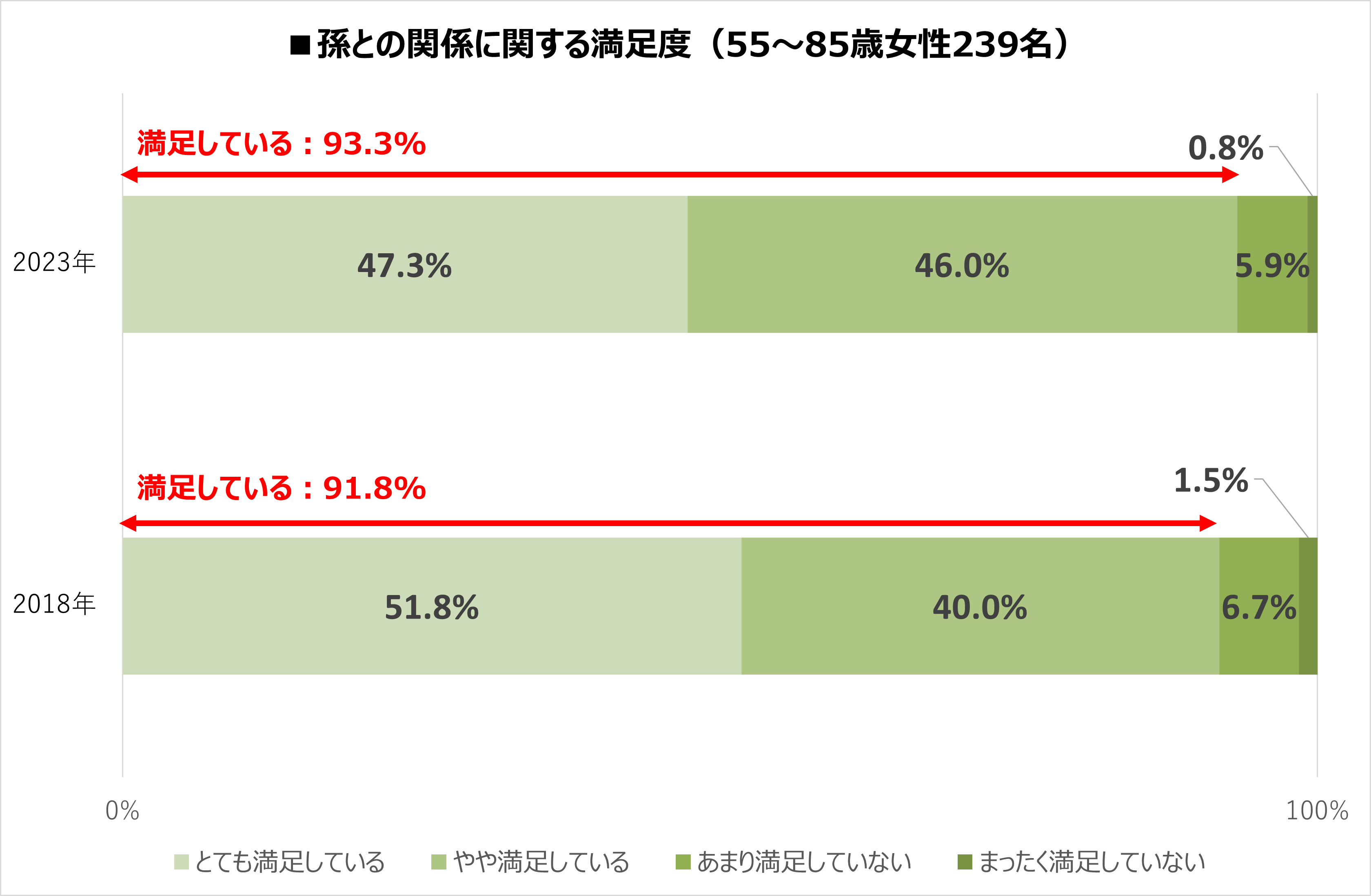 ⇒孫との関係に93.3%が満足と回答。前回調査の91.8%よりも満足度が高まっている。
