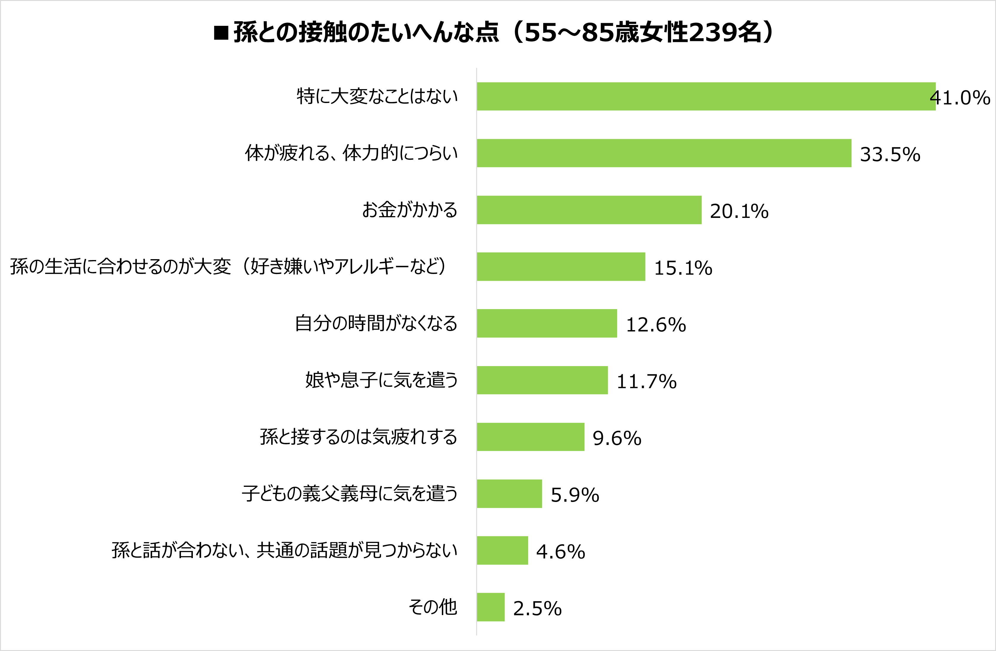 ⇒孫との接触での良いことは「元気をもらえる」77.8%、「楽しい」73.2%、「孫の将来の楽しみが得られる」51.5%。