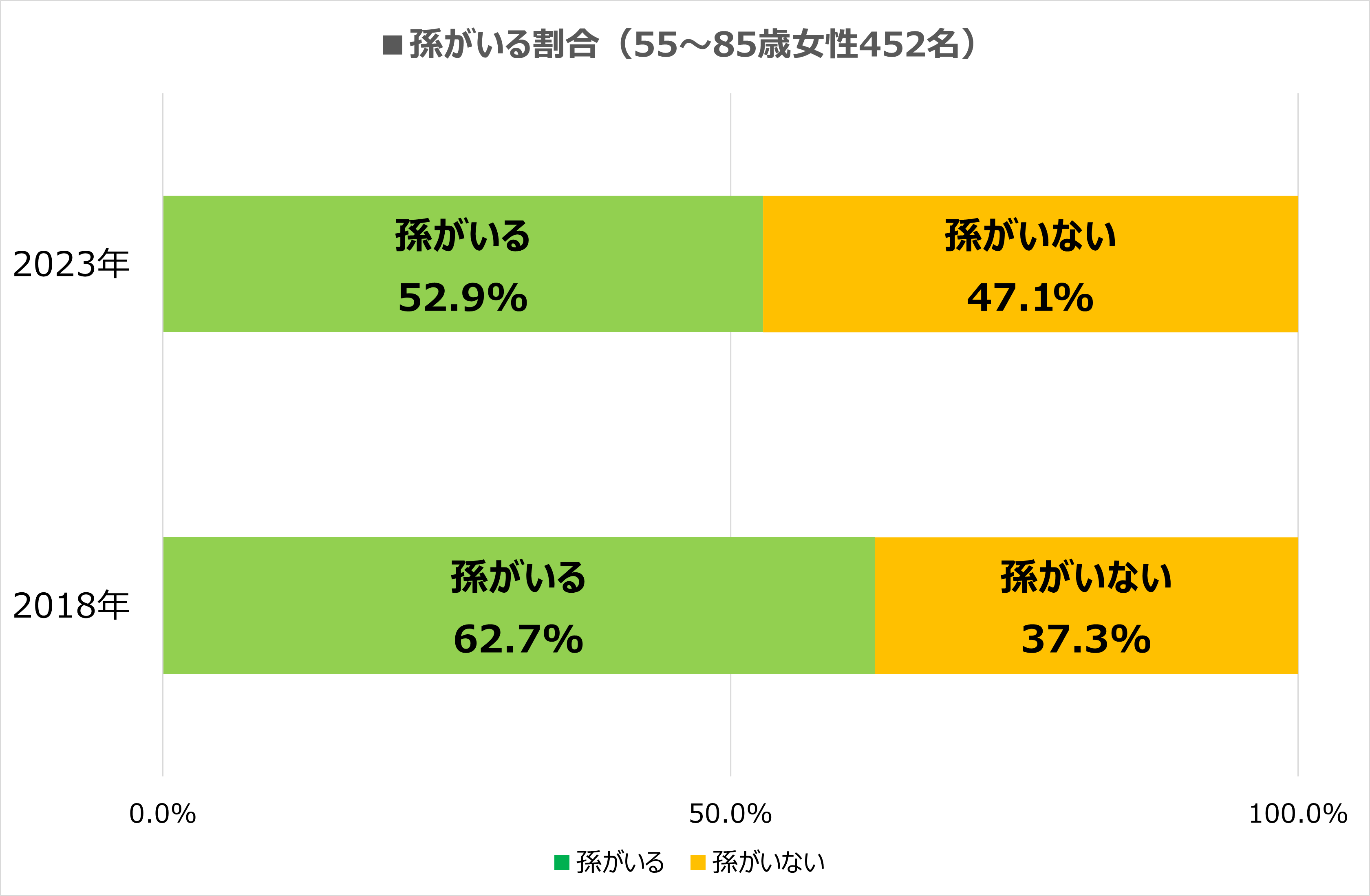 孫がいるシニア女性について、2018年調査の62.7%と比べ、2023年調査では52.9%と約10ポイント低下