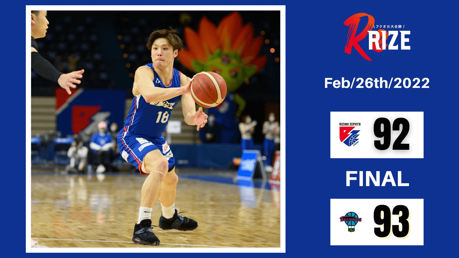 2022年2月26日(土)に開催されましたBリーグ第23節【ライジングゼファーフクオカvs,佐賀バルーナーズ】において“福岡92-93佐賀”の結果となりましたことお知らせいたします。