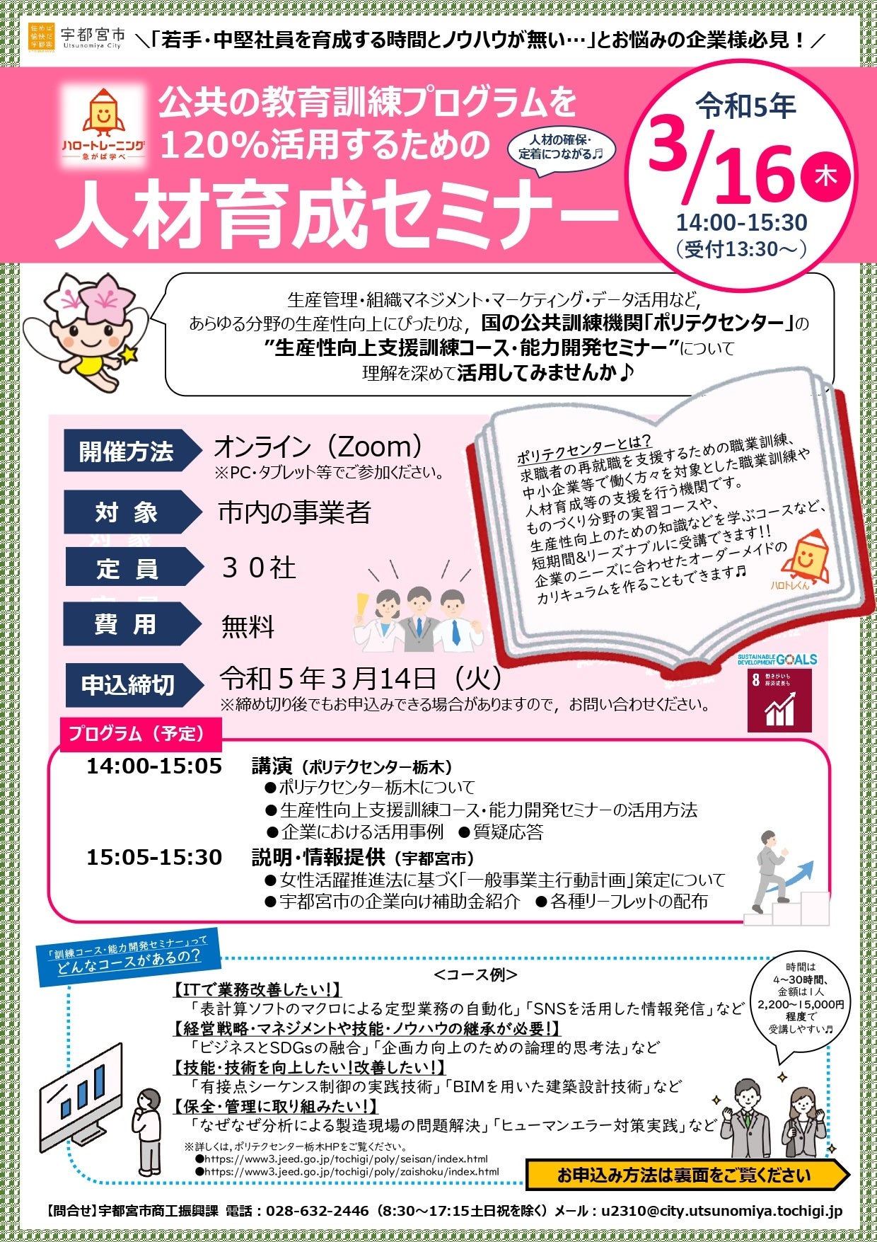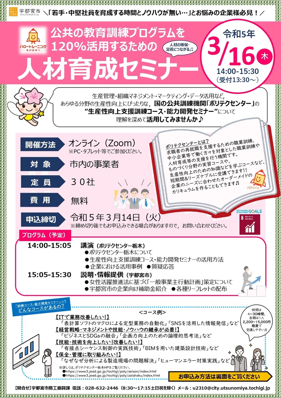 宇都宮市では,市内事業所における人材の確保・定着促進を目的に,「公共の教育訓練プログラムを120%活用するための人材育成セミナー」を開催いたします。参加を御希望される事業所におかれましては,下記及び別添チラシを御参照の上,お申し込み下さい。