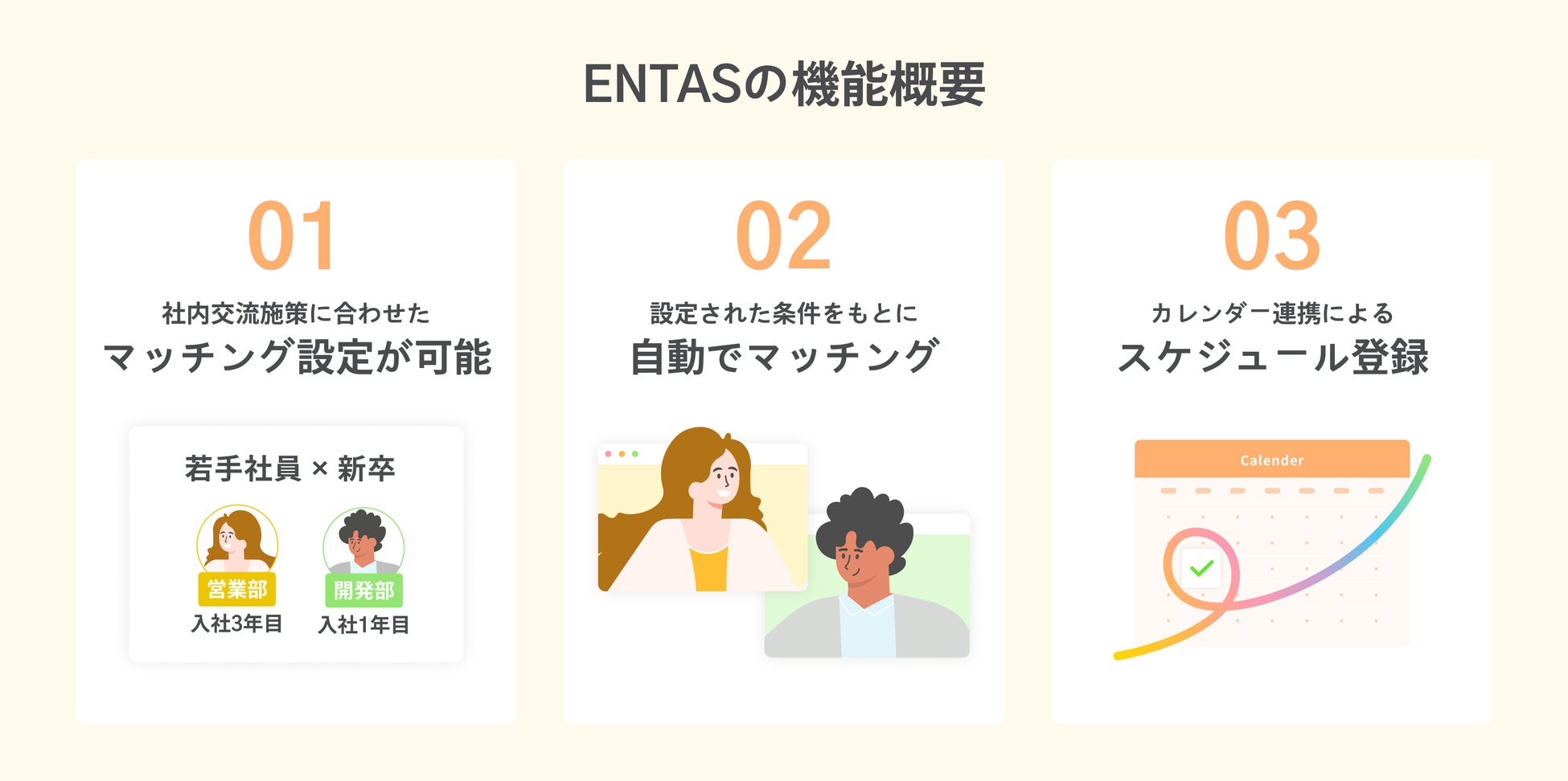 「ENTAS」では従業員情報を元に、普段は話す機会の少ないメンバー同士をマッチングさせ、カレンダーへの予定入力まで自動で行うことで、手軽に継続的に会話の場を設けることが可能です。日常的なコミュニケーション活性化を促すことでメンバー同士のネットワーキングを支援し、メンバーや部署間における心理的安全性の確保や生産性 / 定着率向上をサポートします。
