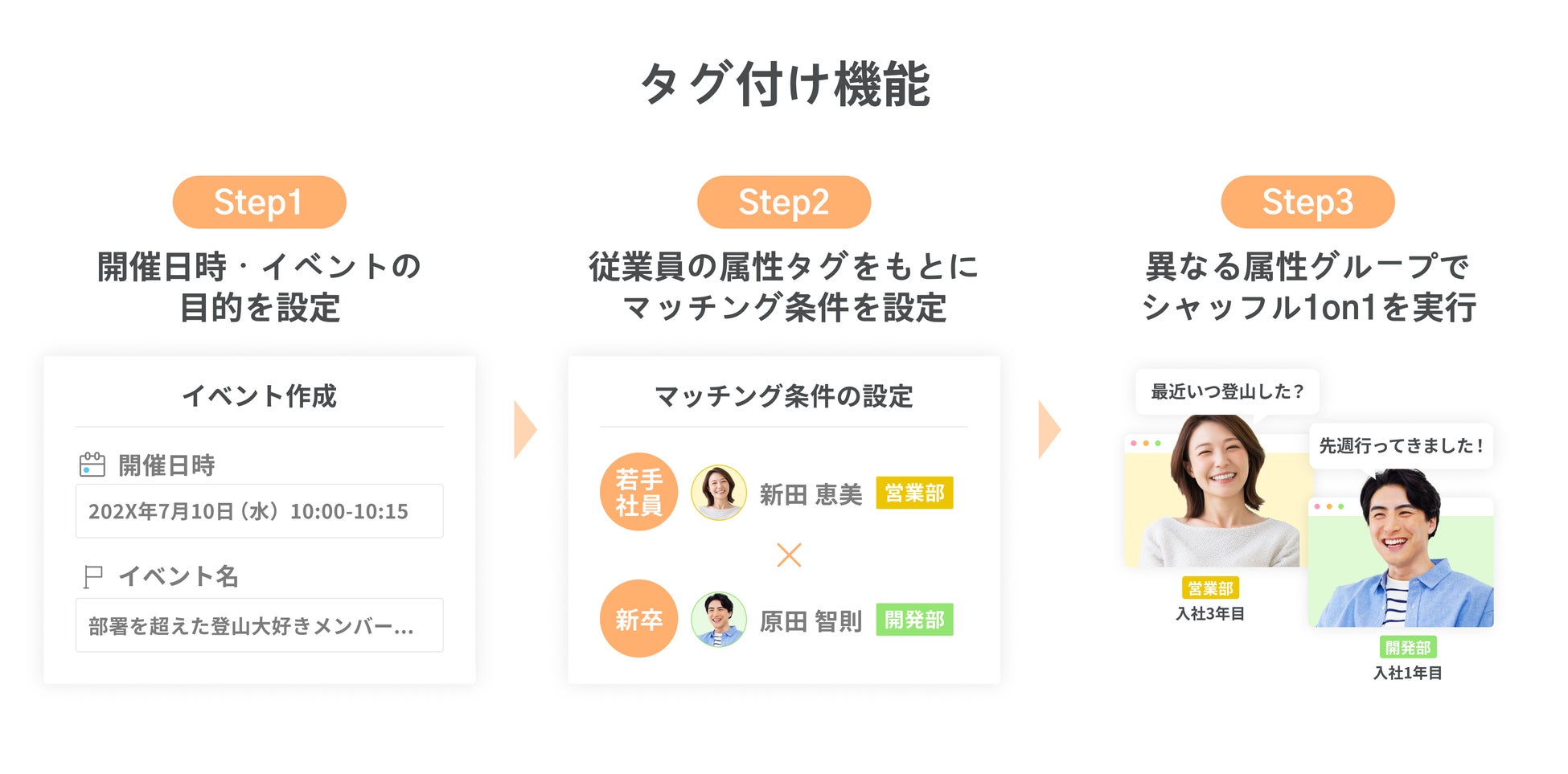 また、登録した属性ごとにソートをかけることができるため、「新卒と中堅社員」「特定の他部署同士」など、異なる属性同士のマッチング条件が手軽に設定でき、目的に合わせた交流施策を柔軟に設計することが可能です。
