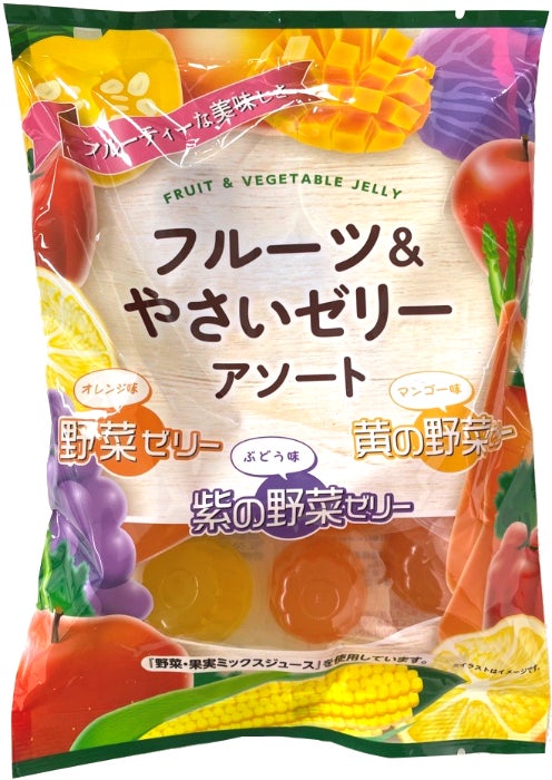 「フルーツ&やさいゼリーアソート」は「野菜・果実ミックスジュース」を使用した野菜ゼリーアソートです。食べやすいようフルーツ味に仕上げているので、野菜が苦手な小さなお子様でも美味しく食べることができます。