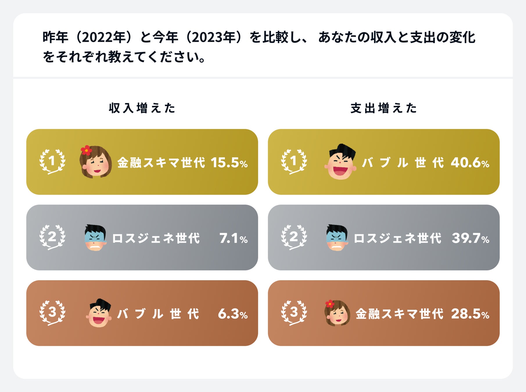 「昨年(2022年)と今年(2023年)を比較し、 あなたの収入と支出の変化をそれぞれ教えてください。」という質問に対して、「収入が増えた」ランキング1位は「金融スキマ世代」15.5%でした。