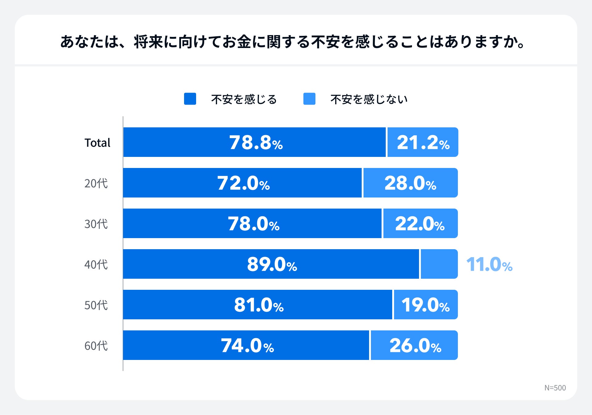 「あなたは、将来に向けてお金に関する不安を感じることはありますか。」という質問に対して、「不安を感じる」78.8%という結果になりました。