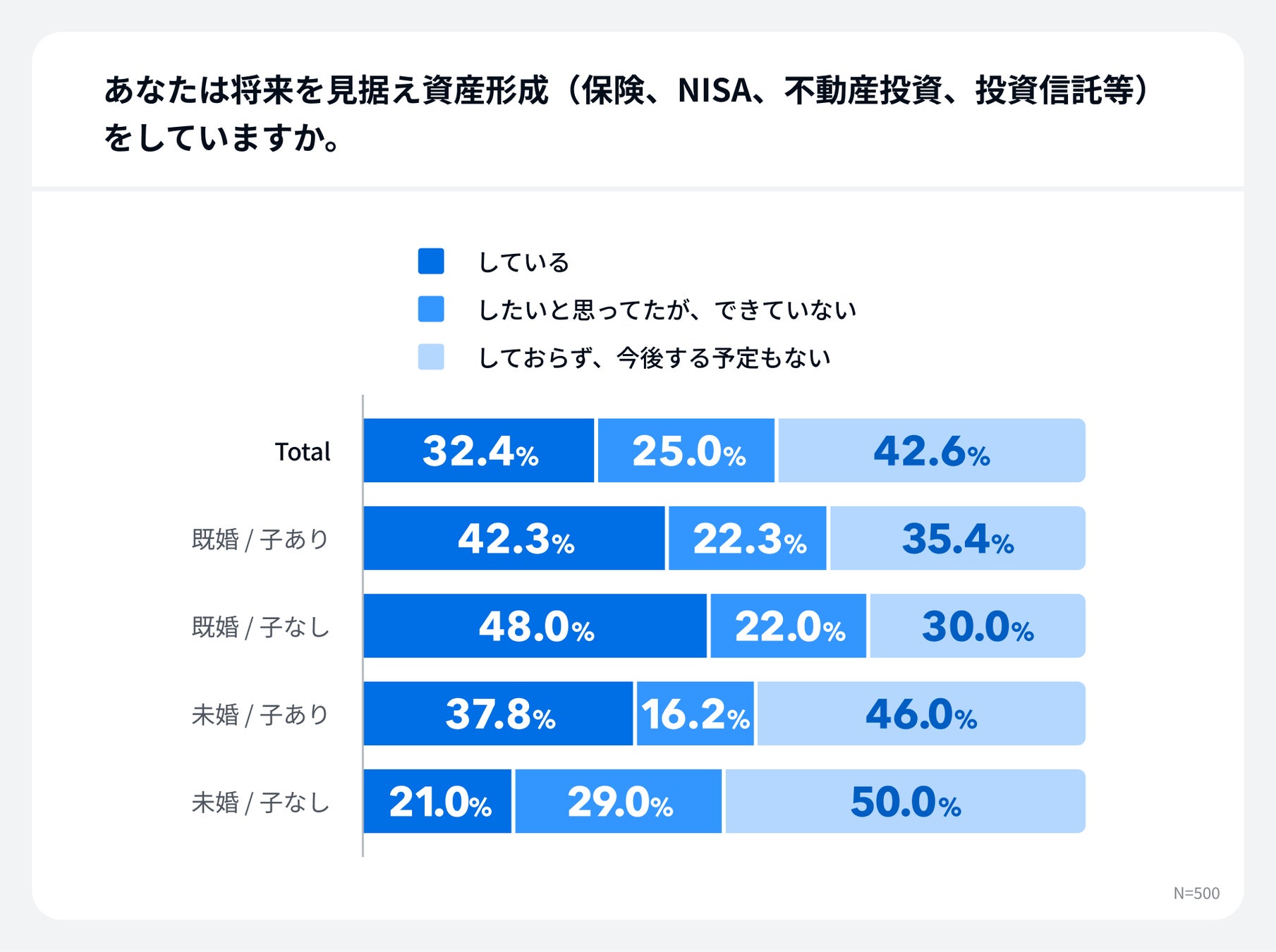 「あなたは将来を見据え資産形成(保険、NISA、不動産投資、投資信託等)をしていますか。」という質問に対して、「している」32.4%、「したいと思っているが、できていない」25.0%、「しておらず、今後もする予定ない」42.6%という結果になりました。