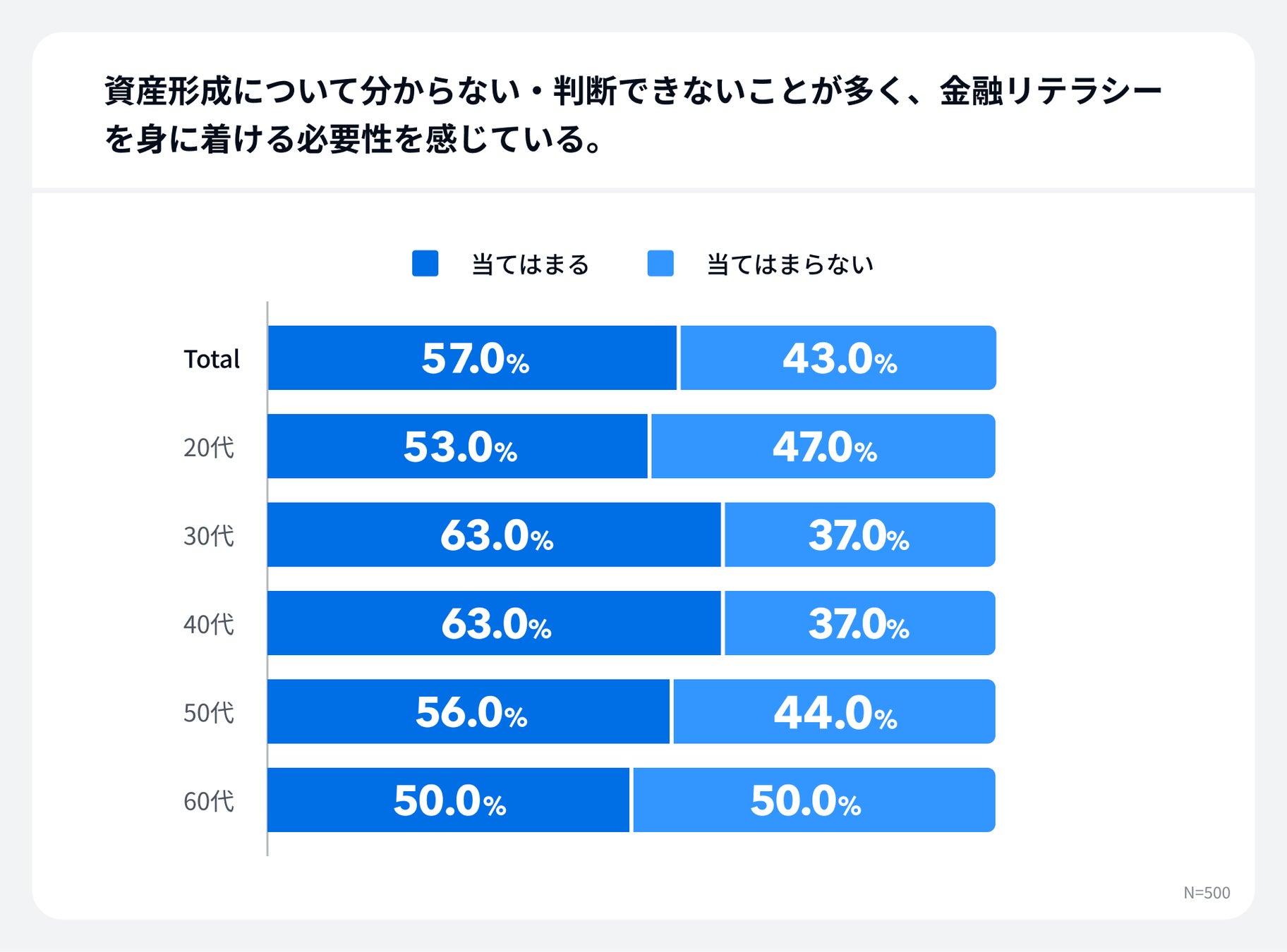 ・金融リテラシーの必要性を感じている人は57.0%、30~40代が最も高く63.0%