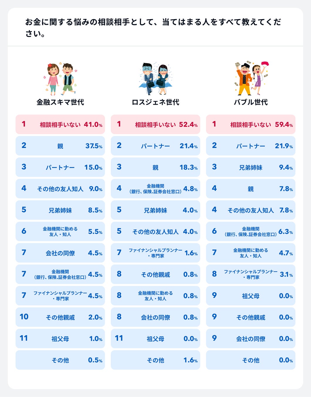 ・お金に関する相談相手がいる1位は「金融スキマ世代」で、親への相談が主流(37.5%)。「ロスジェネ世代」と「バブル世代」は約半数が相談相手はいないと回答しており、世代間での相談傾向に差が見られる