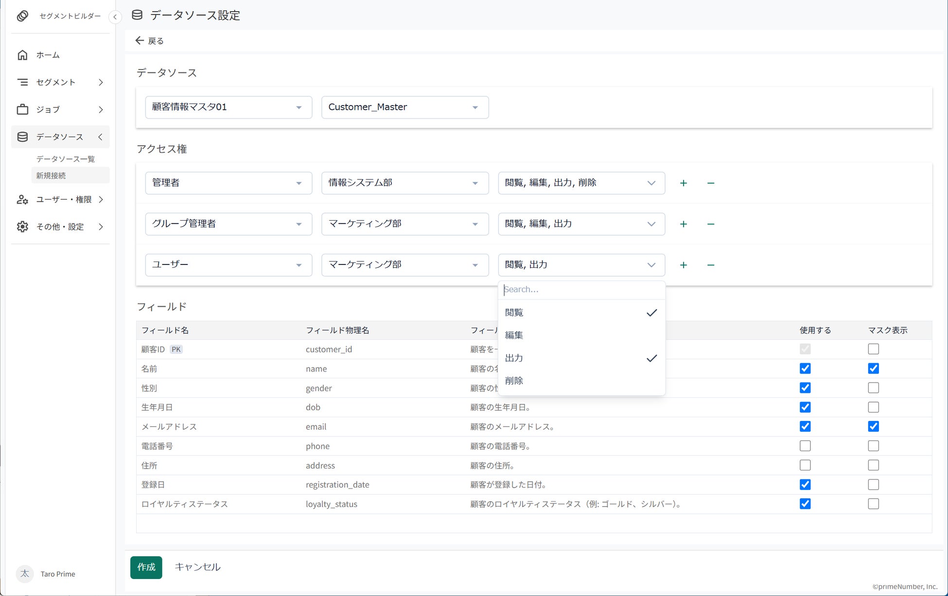 セグメント抽出対象となるデータソースの設定機能:ユーザーのロール(役割)によって、編集・閲覧権限や、プレビュー時に個人情報にマスクして表示するなどの設定を行うことが出来ます
