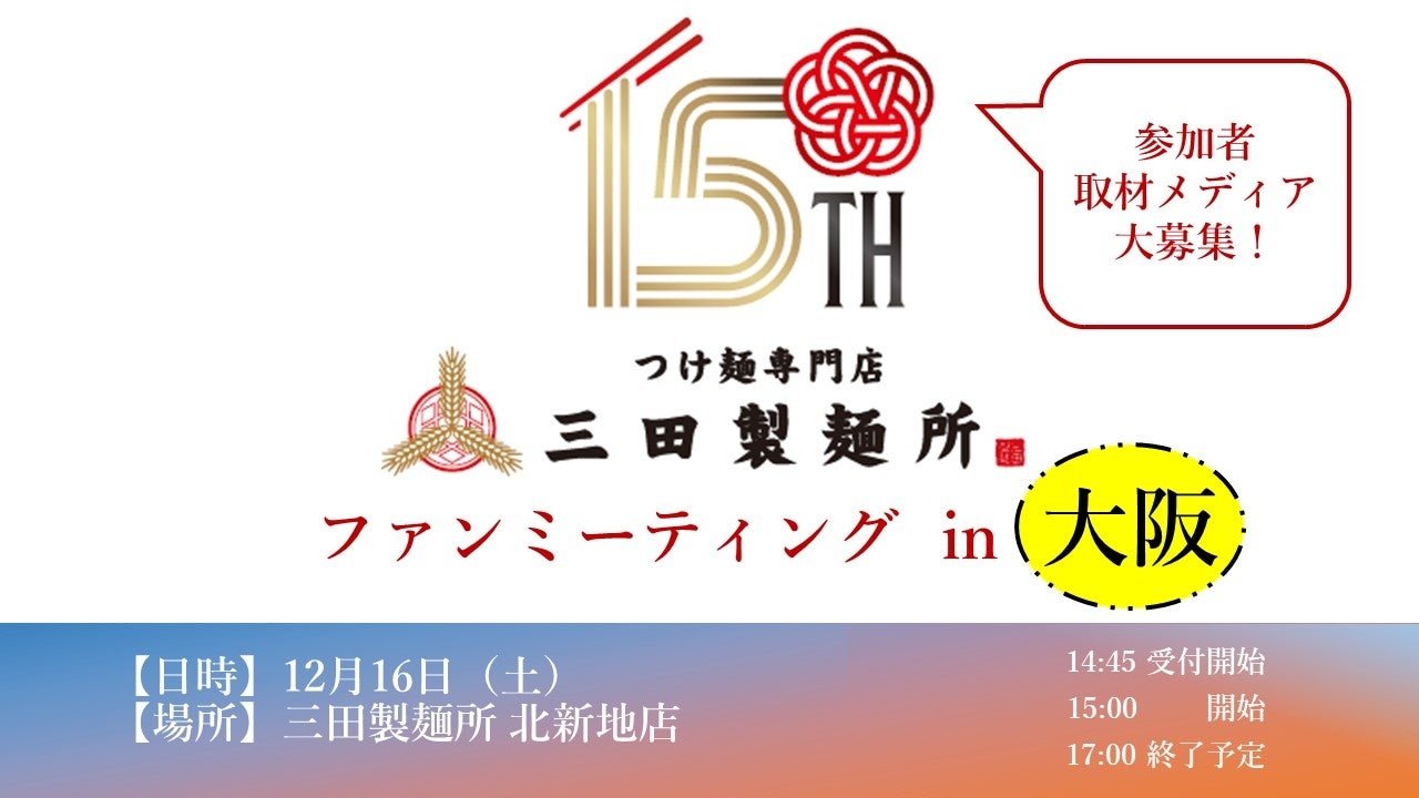 なお、先日開催のファンミーティングの大変な反響を受けまして、急遽ではございますが、12月16日(土)の15時より、大阪・北新地店での開催も決定いたしました。参加者を西日本にお住まいの、三田製麺所ファンの皆様を中心に公募いたします。定員に限りがございます為、参加者は抽選にて選出させて頂きます。ご希望の方は12月6日(水)までに下記フォームよりエントリー下さいますよう宜しくお願い申し上げます。なお、同行者様は1名まで承ります。