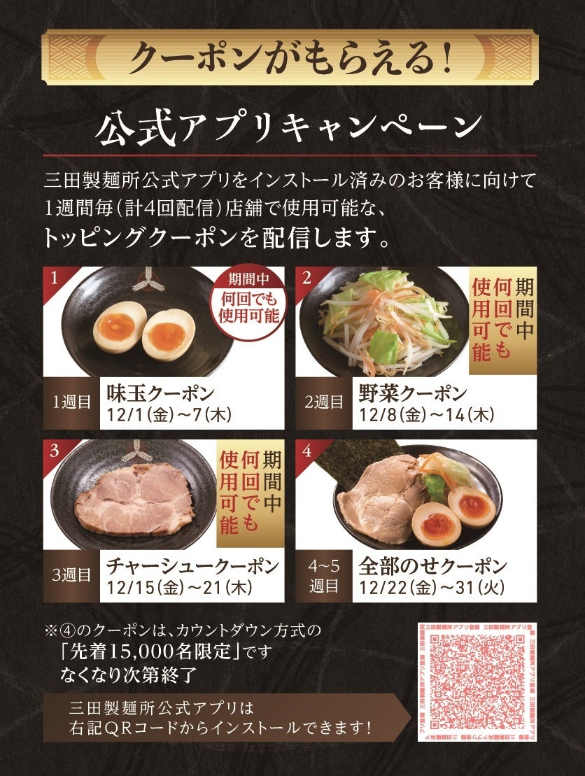 12月1日(金)より、三田製麺所公式アプリにて“何度でも使える”お特なクーポンが週替わりで配信されます。12月22日(金)からの最終週では、全部のせトッピングの無料クーポンを『先着15,000名様限定』の“早い者勝ち”にて配信致します。利用条件などの詳細は、三田製麺所アプリにて配信されるクーポン画像をご確認ください。