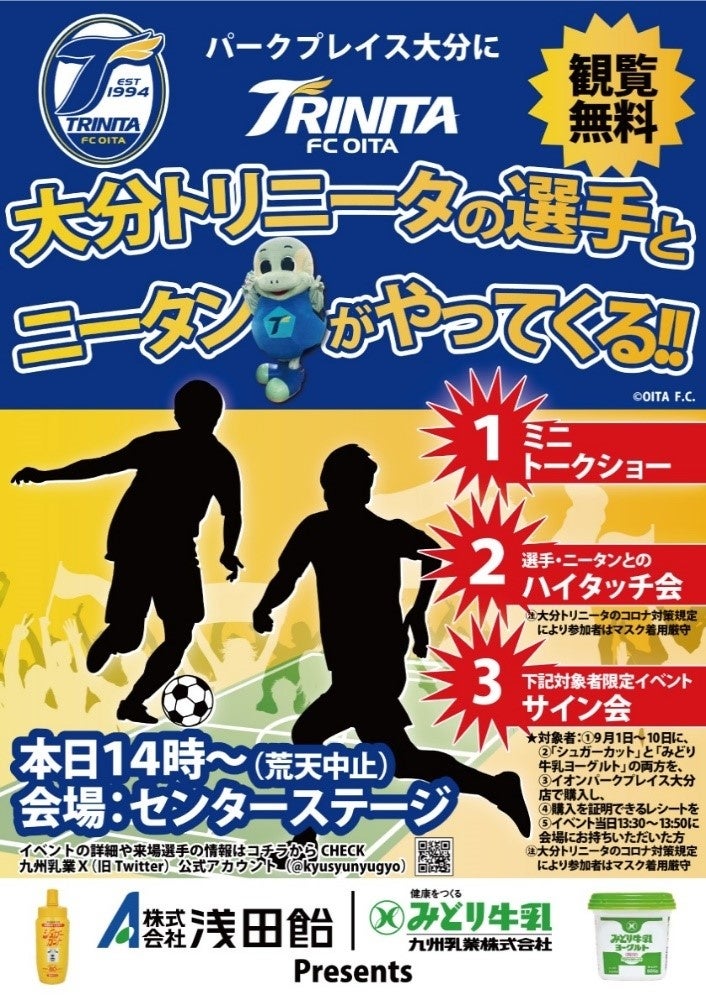 【大分トリニータ】浅田飴シュガーカットとみどり牛乳ヨーグルトでトリニータを応援しよう!キャンペーン開始及び選手とニータン参加イベントを9/10(日)パークプレイス大分で開催