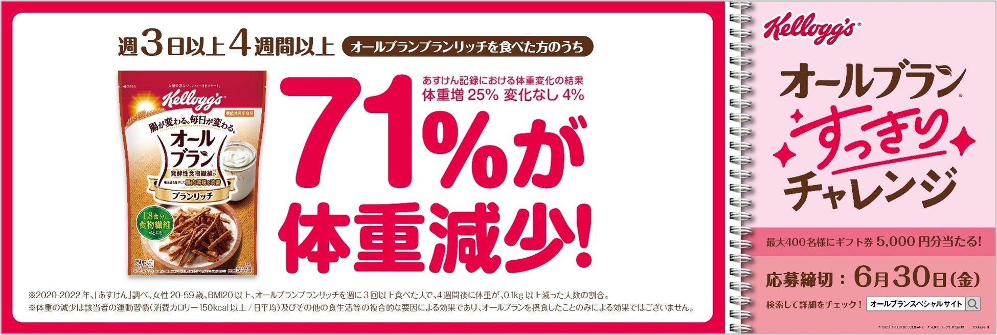 オールブランブランリッチを週3日4週間以上食べた人のうち「71%が体重減少!」* 消費者参加型キャンペーン「オールブランすっきりチャレンジ」を5月8日(月)より開始