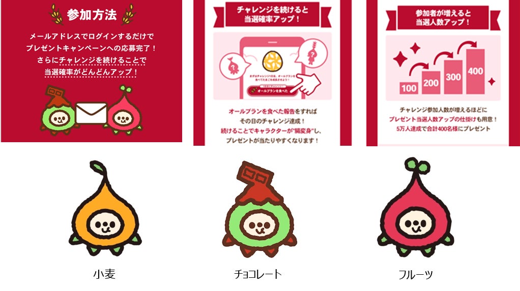 メールアドレスを登録、もしくはログインすると、ご自身の日頃の食習慣や運動習慣に関する質問があり、それに答えるとチャレンジを応援してくれるキャラクターのたまごが生成されます。キャラクターは3種類。熱い性格でチャレンジャーを応援してくれる「小麦」。優しい性格でたくさん褒めてくれる「チョコレート」。明るく楽しい性格で盛り上げてくれる「フルーツ」。性格に紐づいて、ユーザーがチャレンジした後のキャラクターのセリフが変わります。最初はキャラクターがたまごの状態から始まるチャレンジは、オールブランを食べてチャレンジクリアしていくごとに、景品の当選確率がアップするだけでなく、可愛いパートナーキャラクター達も3日ごとに「腸変身」していきますので、その様子もお楽しみいただけます。さらに、成長フェーズ以外にも、可愛いアクションやセリフでユーザーのチャレンジを盛り上げてくれますので、ぜひご注目ください。