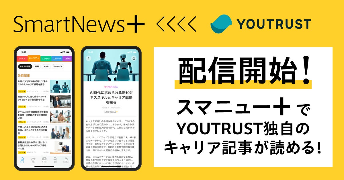 日本のキャリアSNSおよびネットワークリクルーティングサービスの「YOUTRUST」を開発・運営する株式会社YOUTRUST(本社:東京都渋谷区、代表取締役CEO:岩崎由夏)は12月11日より、国内外の有料メディアの厳選記事が読めるサブスクサービス「SmartNews+」とのパートナー連携を行い、同サービスの専門チャンネル「キャリア+」での記事配信を開始したことをお知らせします。