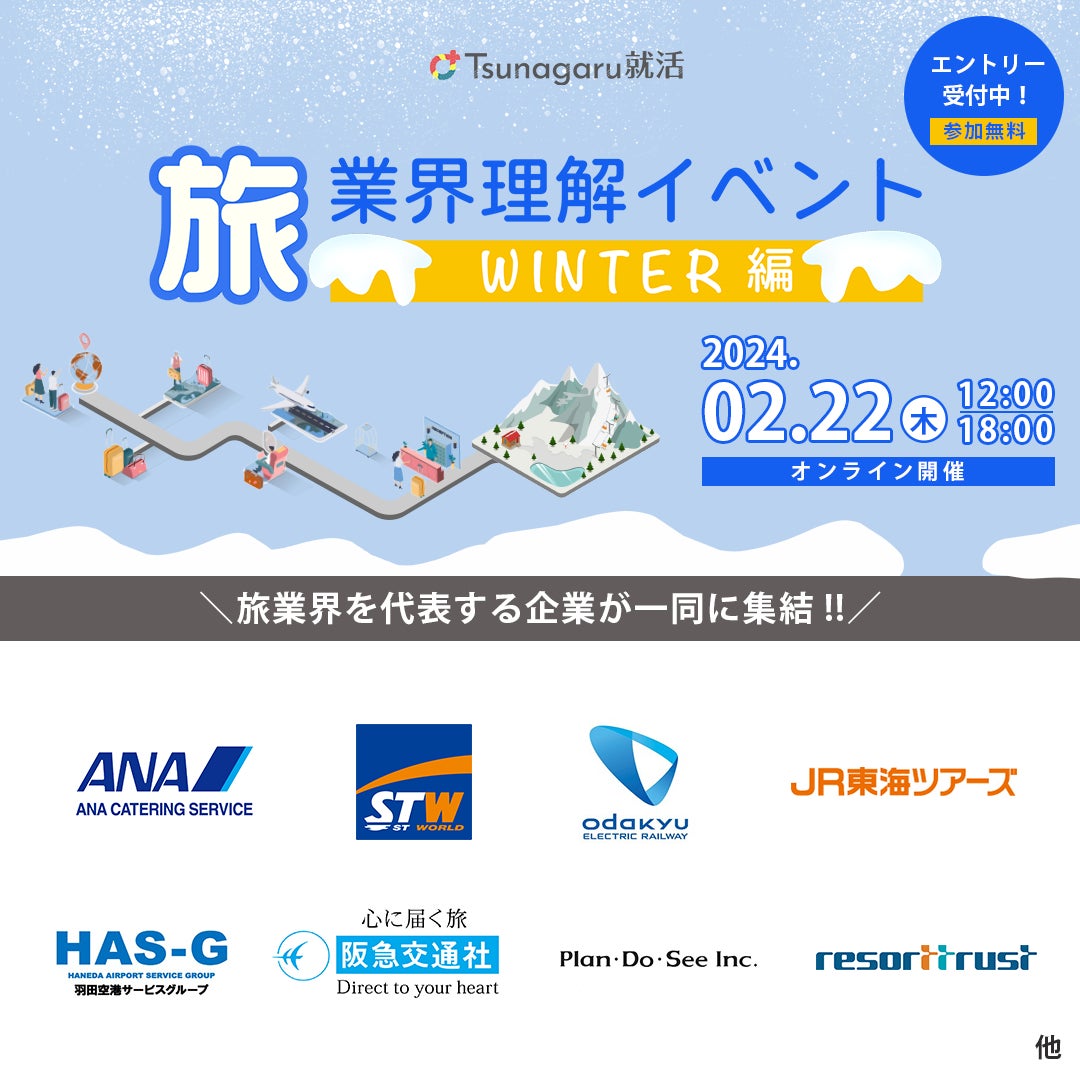 当イベントは、25卒学生を対象とした選考直前対策ができる旅業界特化型のオンラインイベントです。多くの就活生は、消費者として知っている企業に興味をもつ傾向にあります。旅業界もその一つです。当イベントを通して、旅業界の各社のつながりを知ることができます。8月に開催したSUMMER編に続き、2月22日(木)にWINTER編を開催。