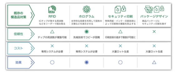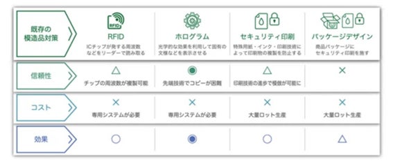 従来のトレーサビリティでは、HyperJ IDシール自体の偽造や、アクセスした先のサイトが不正サイトなどのリスクがありました。また、ブロックチェーンを使った真贋システムは高コストで実用化が困難でしたが、リーガルテック社の新技術は低コスでブロックチェーンを活用した自社専用の真贋判定システム構築が可能になりました。