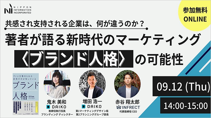 しかし、一言でブランディングと言っても、広義に解釈ができるワードであることからメンバー間で共通認識を持てていなかったり、体系化できておらずうまく進められていなかったりと悩まれている企業も多いのではないでしょうか。そこで今回は、『ファンを集められる会社だけが知っている「ブランド人格」』の著者である当社取締役執行役員 ブランディングディレクターの鬼木が、ブランドを“一人の人間”として位置づける「ブランド人格」の考え方や活用機会について講演させていただきます。