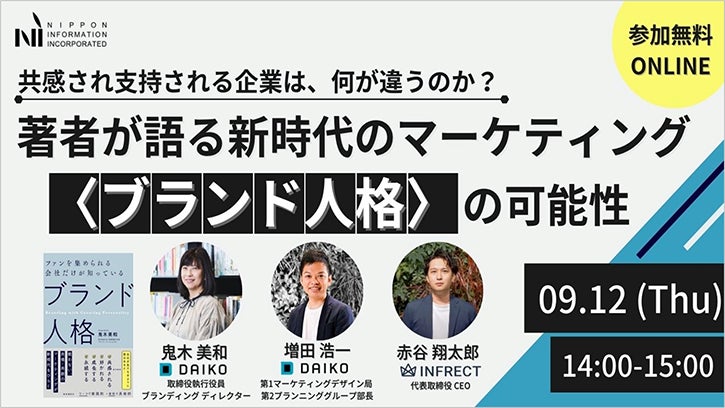 また、同じく当社で未来から現在へ“逆算発想”で、中小・ベンチャー企業を支援するミラストプロジェクトのリーダーである増田、インフルエンサーを企業のマーケティングに参画するサービスを提供する株式会社INFRECT代表取締役CEOの赤谷様との対談を通して、具体的にブランド人格作成の事例やブランド人格を中心に据えた“戦わない”次世代のマーケティングについてお話しいただきます。