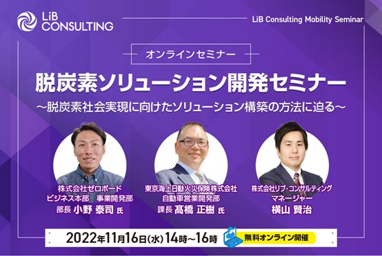 株式会社リブ・コンサルティング(本社:東京都千代田区、代表取締役:関 厳)は、カーボンニュートラル実現に取り組まれる企業の方を対象とした、「脱炭素ソリューション開発」をテーマとしたウェビナーを2022年11月16日(水)に開催いたします。