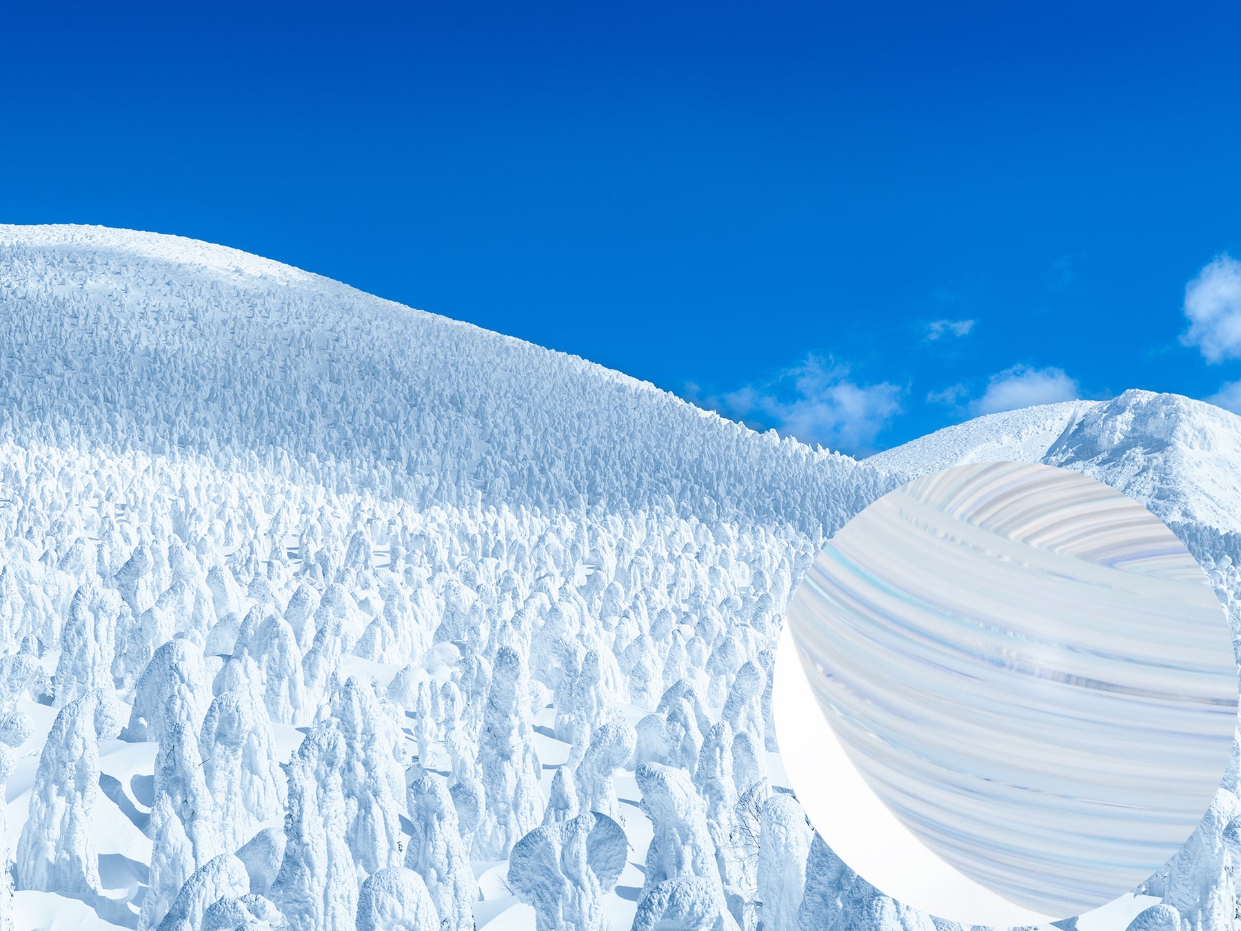 冬には樹木や滝さえも凍る東北。厳しい寒さが作り出す神秘的な雪景色を柔らかな白色の中に青色を織り交ぜて表現しました。