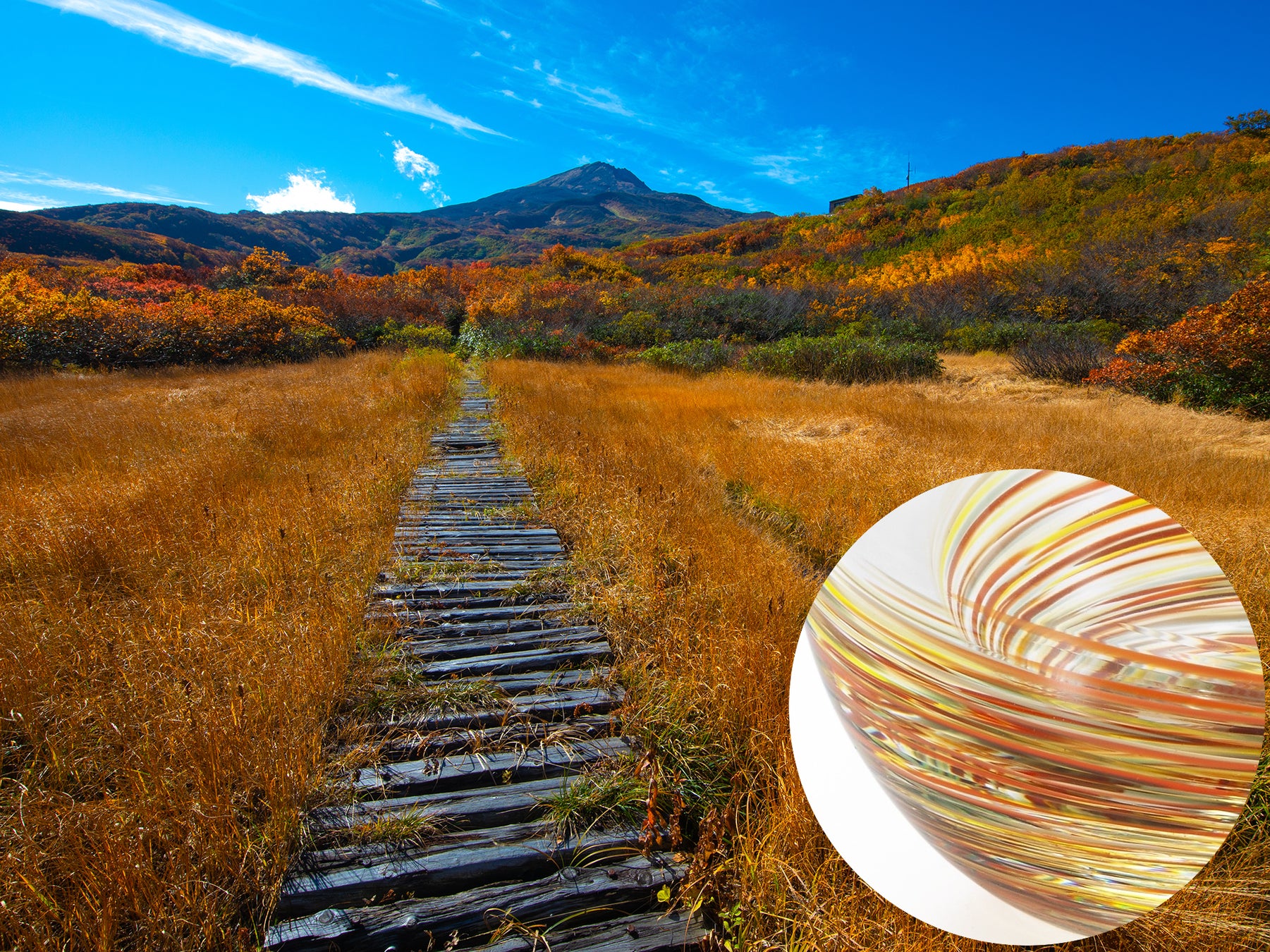 秋には木々だけでなく湿原までも色づく東北の山。紅葉した草木が風に揺れる情景を枯れ草色と橙が調和する色彩で表現しました。
