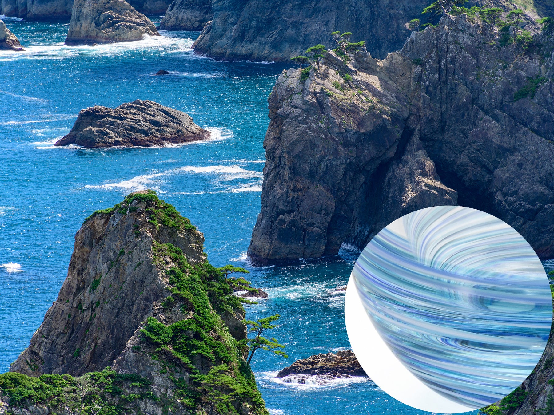 複雑に入り組んだ海岸線が続く東北の海。岩壁に打ち寄せる波の深く透き通った色彩を多様な色調の青色で表現しました。