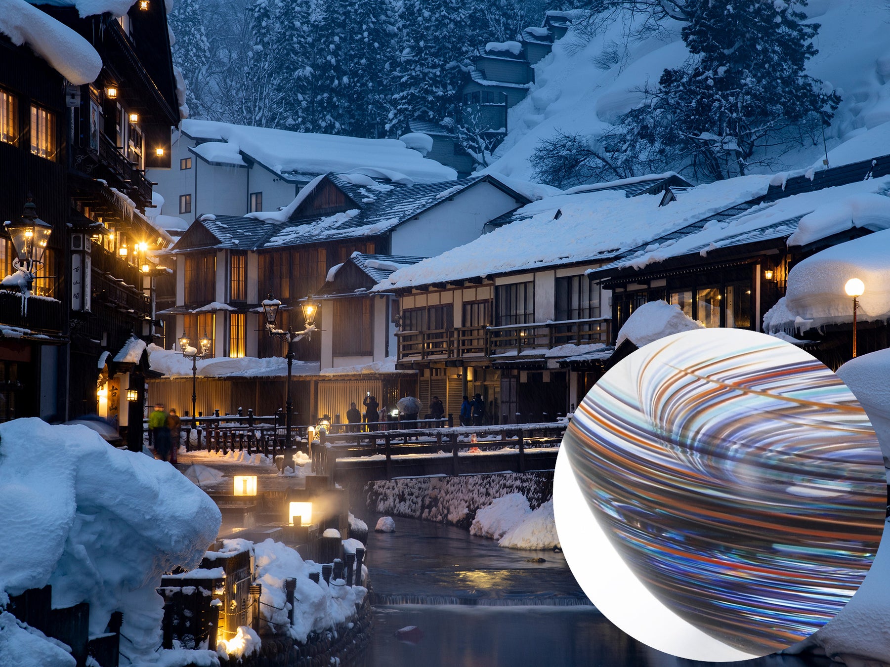 情緒豊かな夜がある東北。集落や温泉地の夜に灯るあかりのあたたかな色彩を濃紺の中に橙色を散りばめて表現しました。