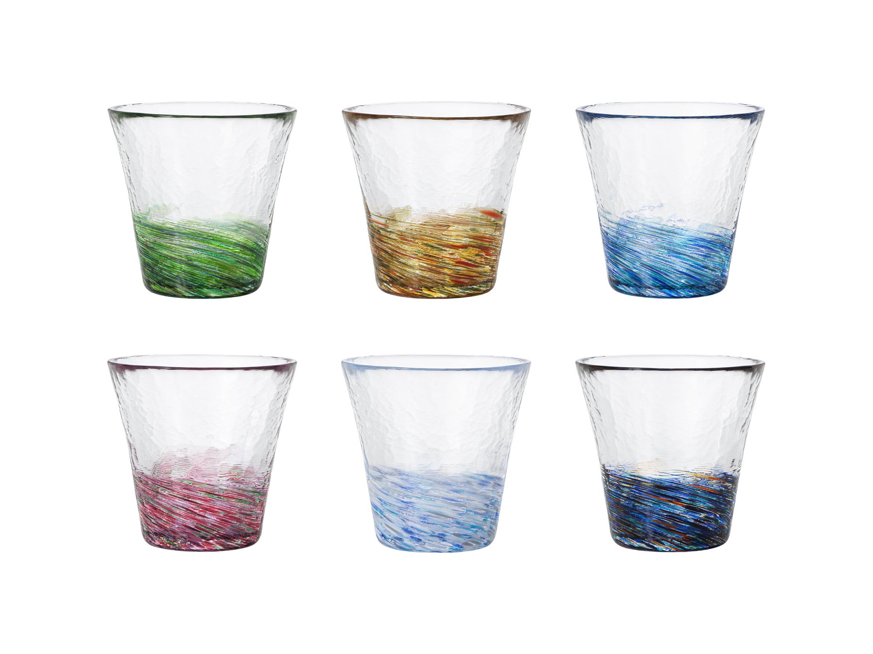 「六の色(むつのいろ)」は、かつて陸奥(むつ・みちのく)と呼ばれた東北地方を象徴する森・山・海・花・雪・夜の六つの情景を、蔵王連峰の雪景色や角館の桜の風景などから着想し、複数の色ガラスを重ね合わせた大胆なひねり模様と深みのあるモダンな色彩で表現したシリーズです。